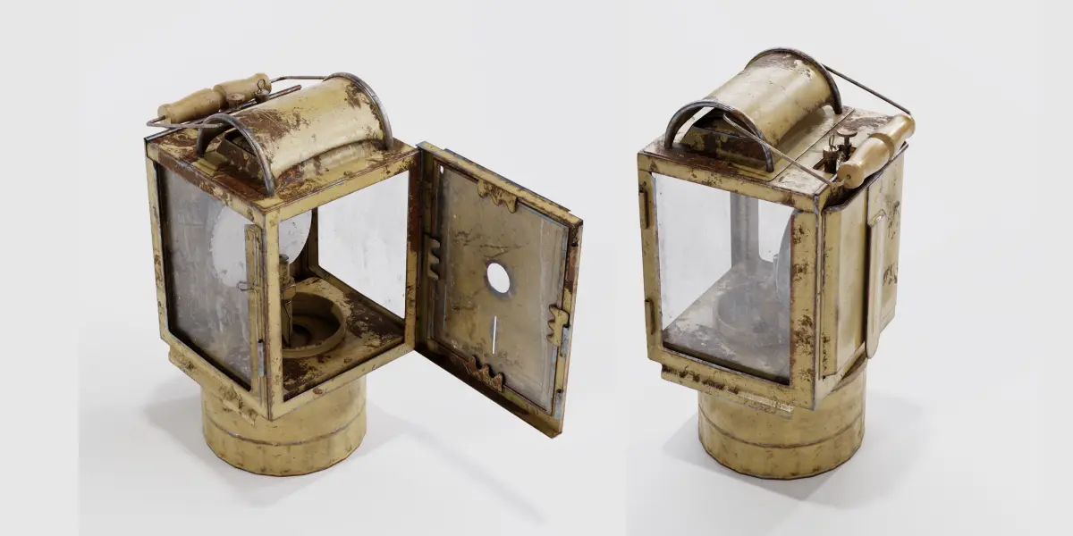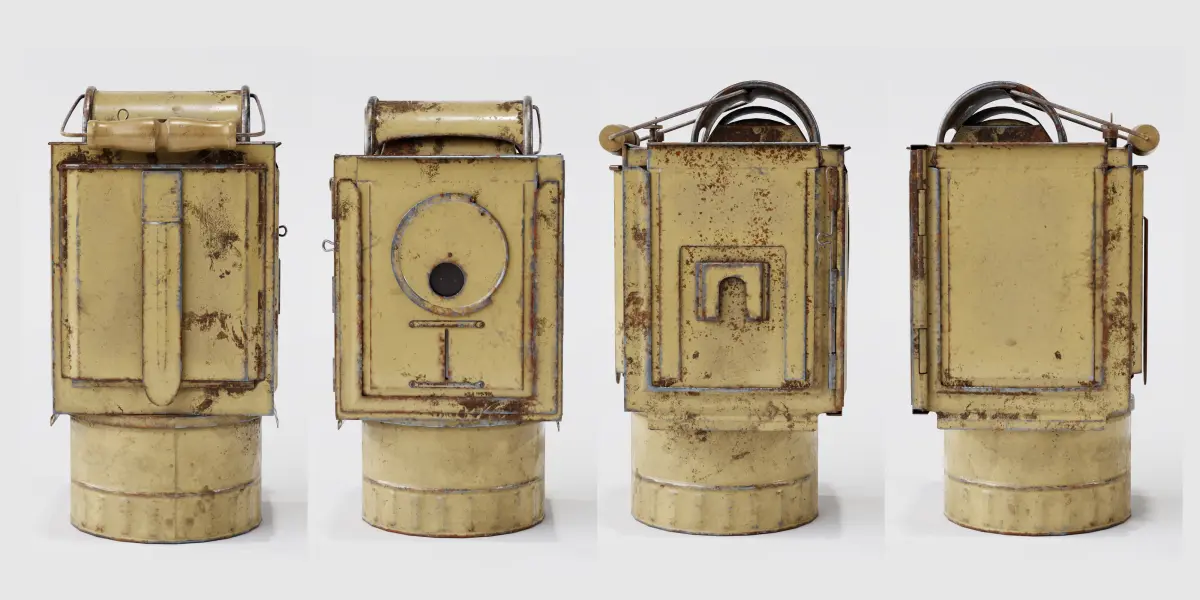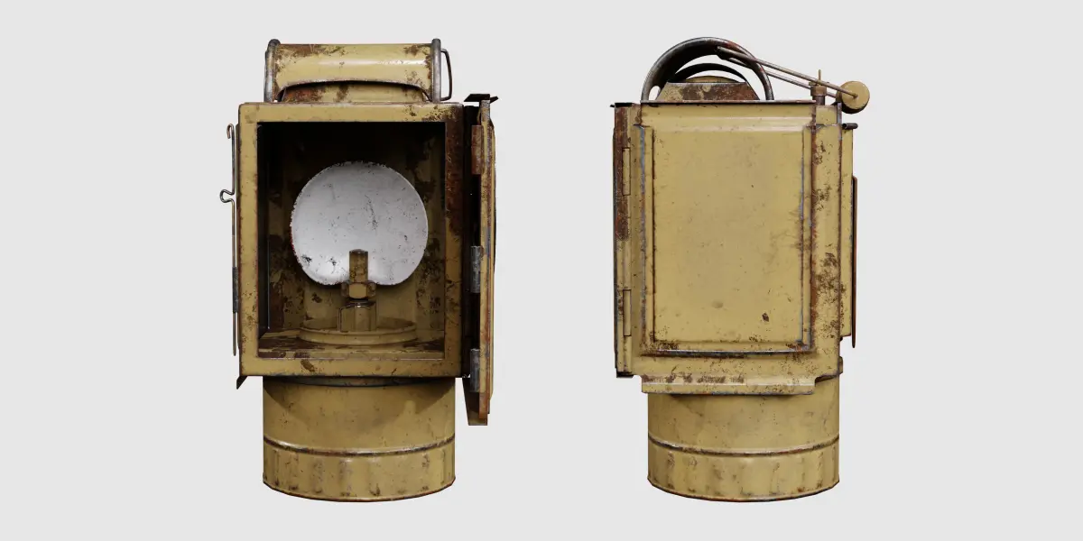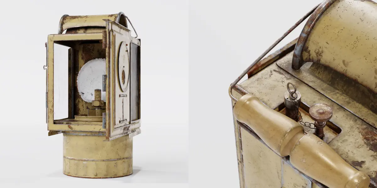 German WWII Carbide Railroad Lantern high quality game ready 3D model, Available in low and high poly blender and FBX format. High poly version is subdivision ready, PBR 4k textures consisting of base color, Alpha, Displacement, Metallic, Normal and Roughness painted in substance painter. This product includes Blender file, FBX exports, PBR material, info text and poster of product.**