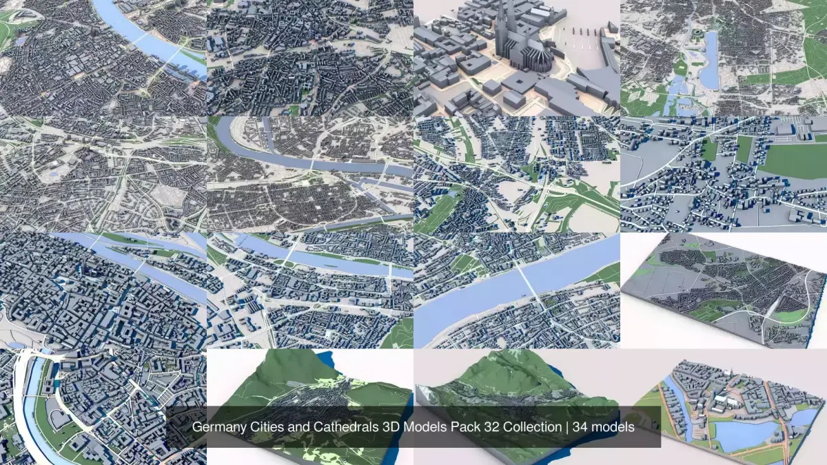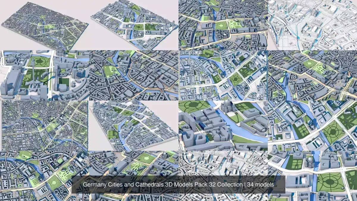 This collection includes 32 Germany-themed 3D models, featuring a mix of:German cities / city map models / cathedrals and historic landmarks