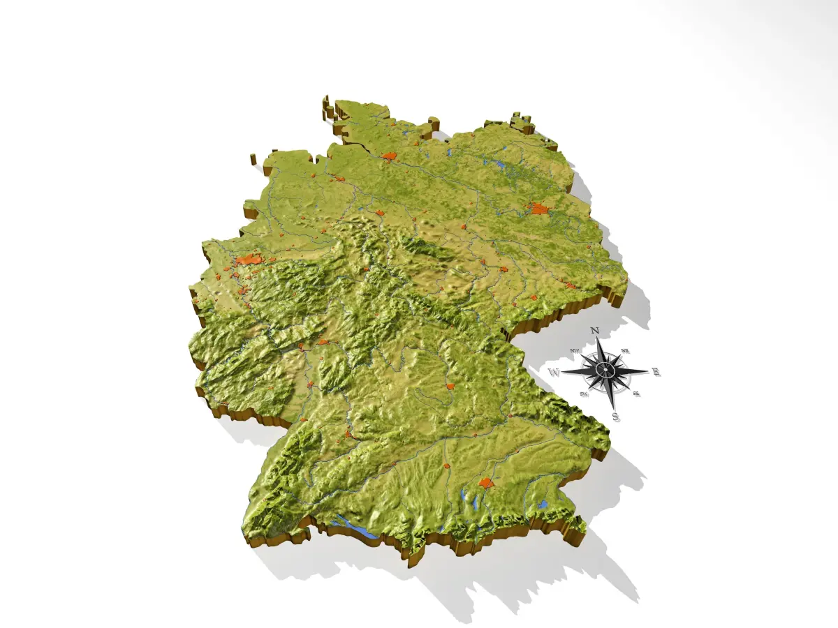 The set contains three models: a 3D relief map of Germany with surrounding area, a separate 3D relief cutout of the state area, and a separate plain cutoutof the state outline.