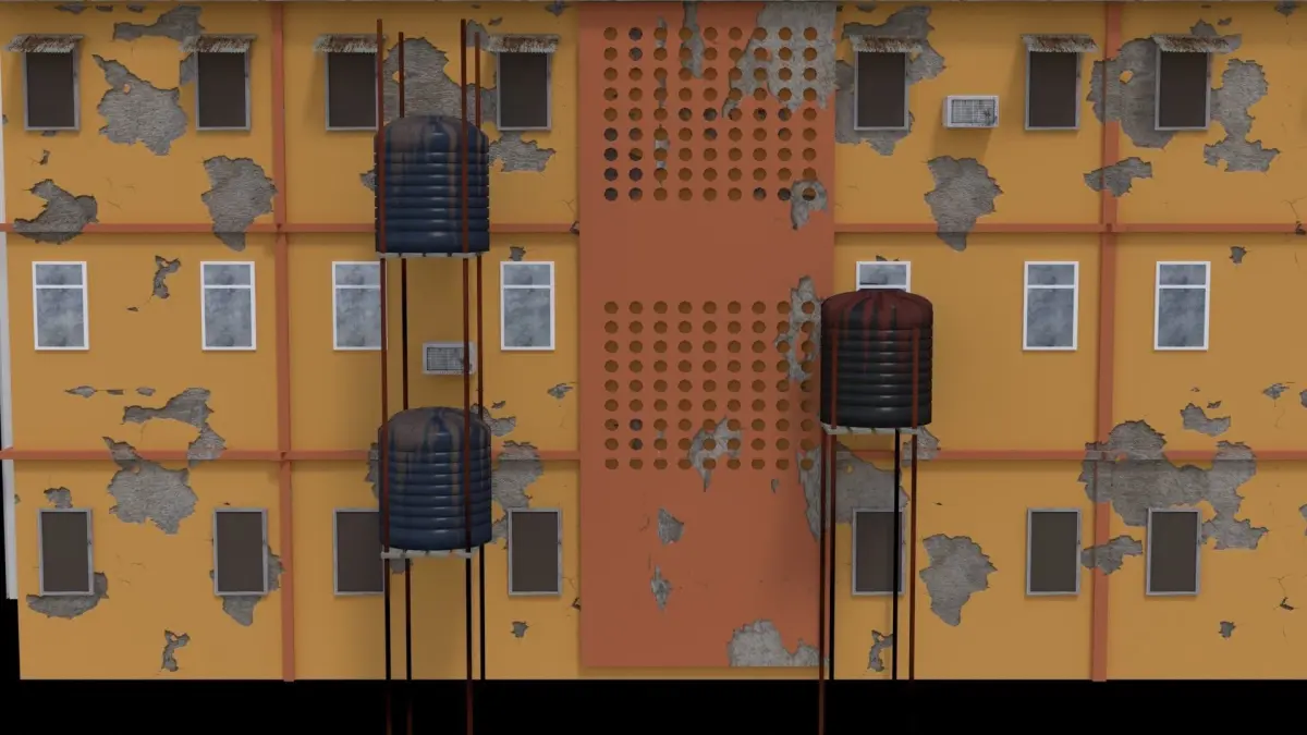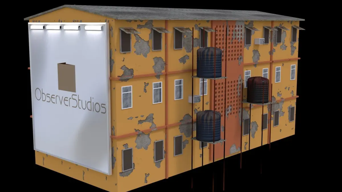 This model was created based on a real building in Lagos, Nigeria. It comes with water tanks and stands for them. This model can be used when creating complex city scenes.File formats: .blend .stl .fbx .gltf .obj