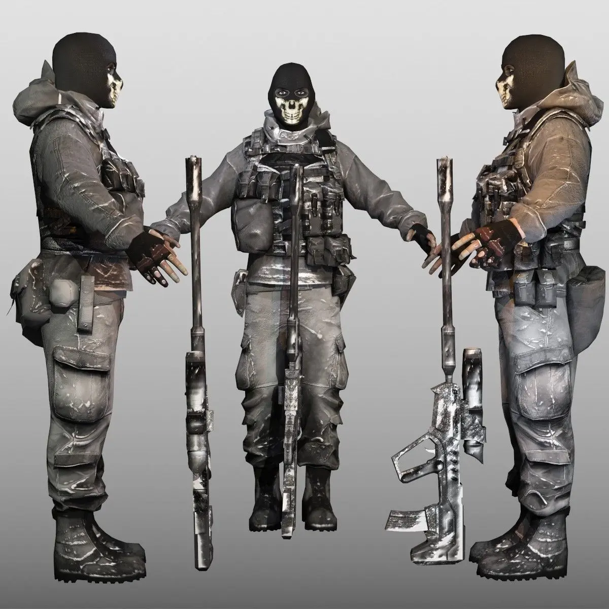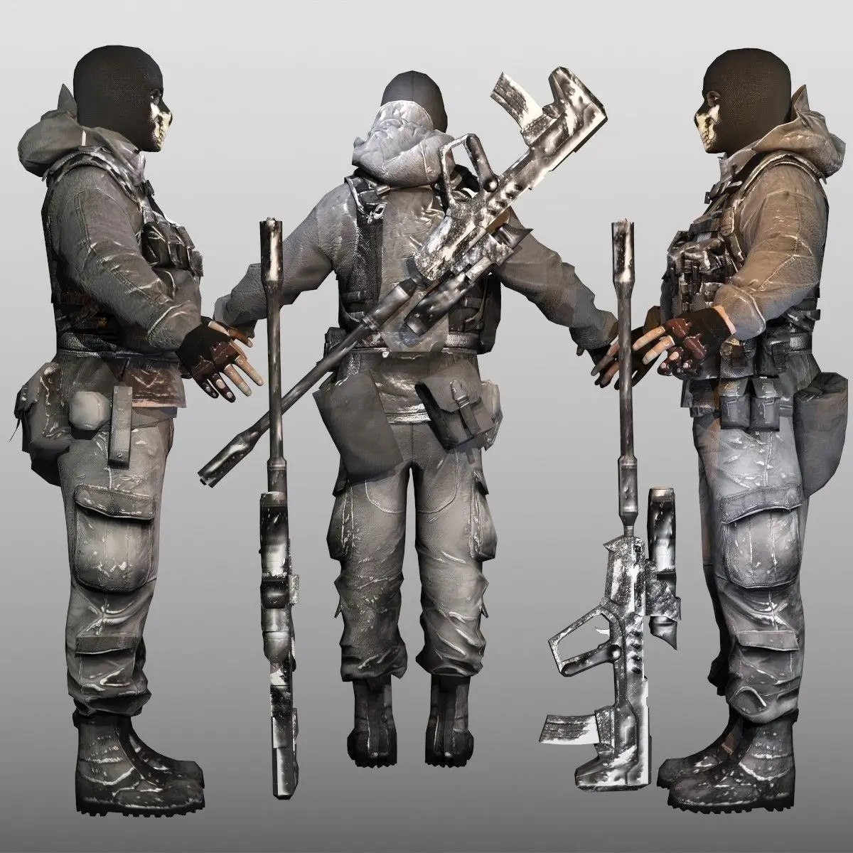 Low poly, game ready. Pose ready for rigging. Material in max file only (Mental-ray).High quality 2048x2048 TGA textures (color, specular, normal) for separate body/clothing parts in 3 variations for high modularity.Character is Ready for Mixamo autorigger and it can be rigged for free!Rifle is included.EnjoyCheck out my other models!