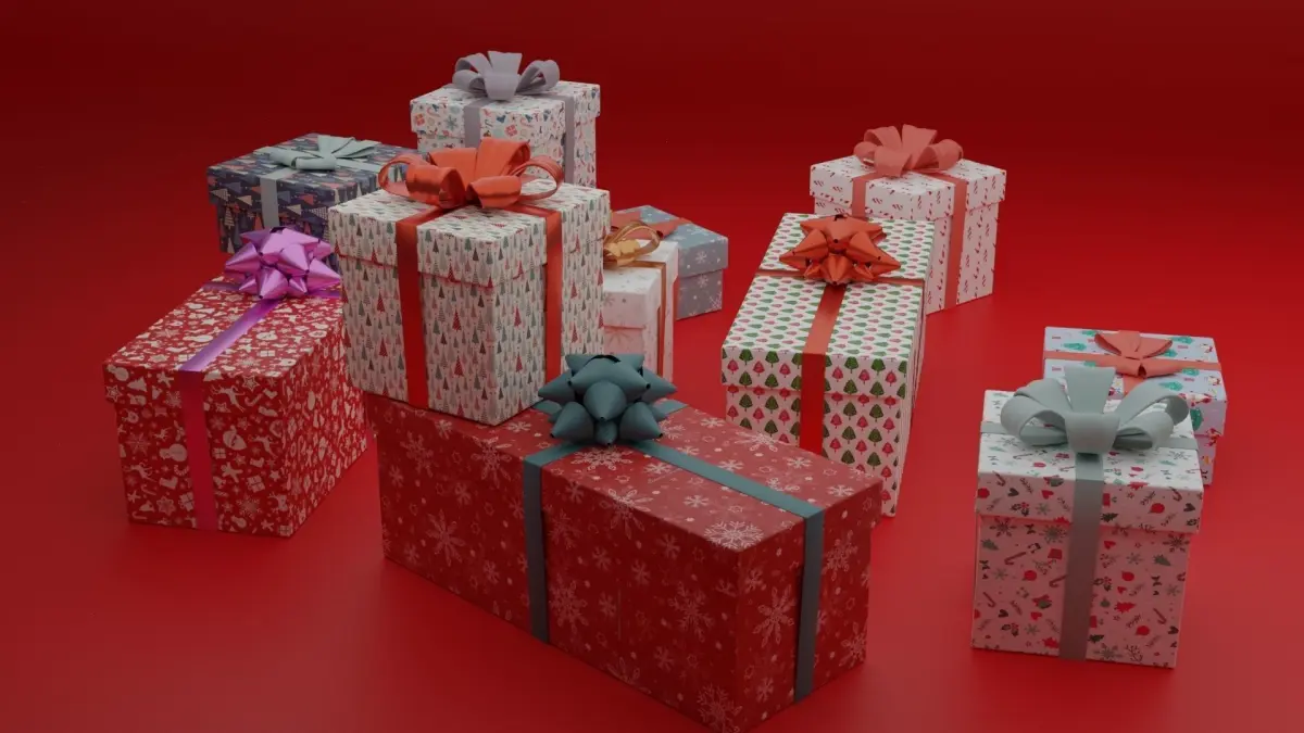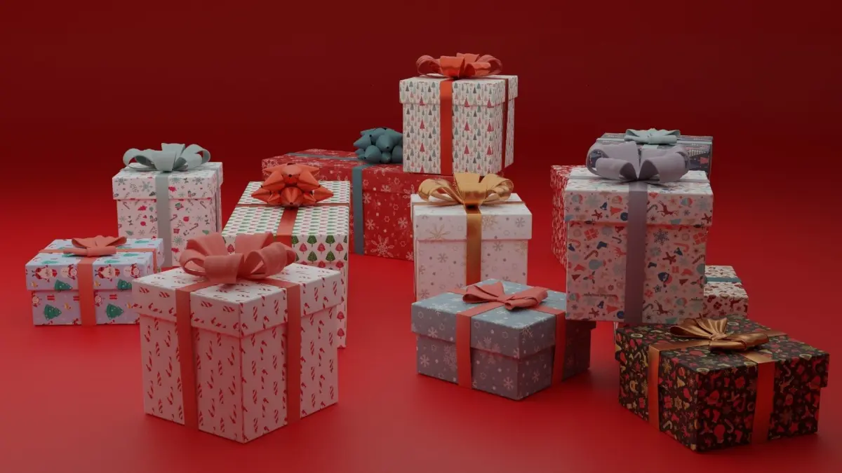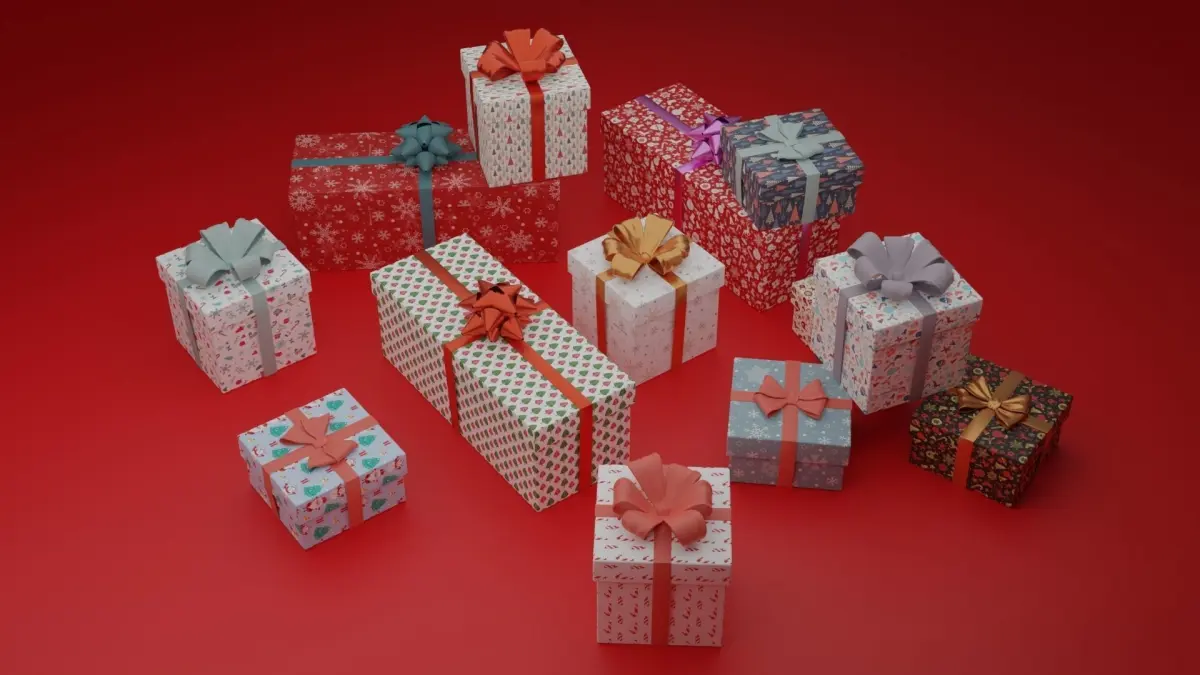 Set of gift boxes christmas. Created in Blender 2.92 and rendered in Cycles. The same cu has 13 boxes with bows, Each box has an independent material and each has a different wrapping paper.