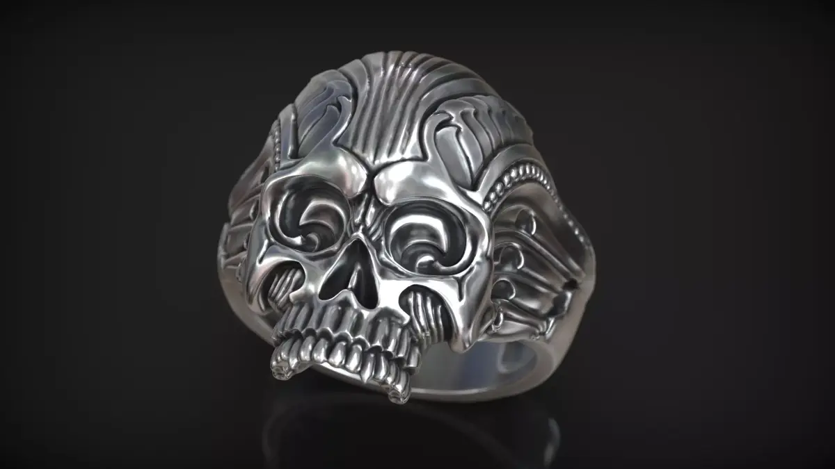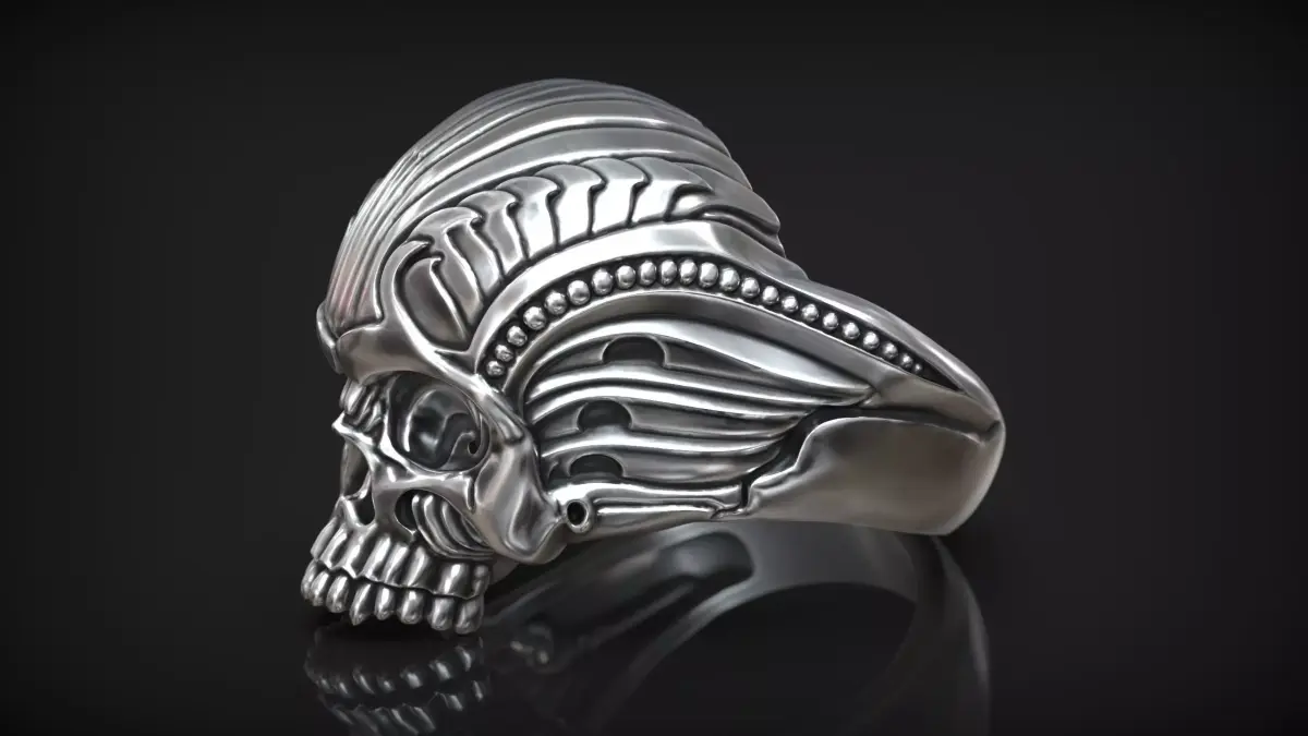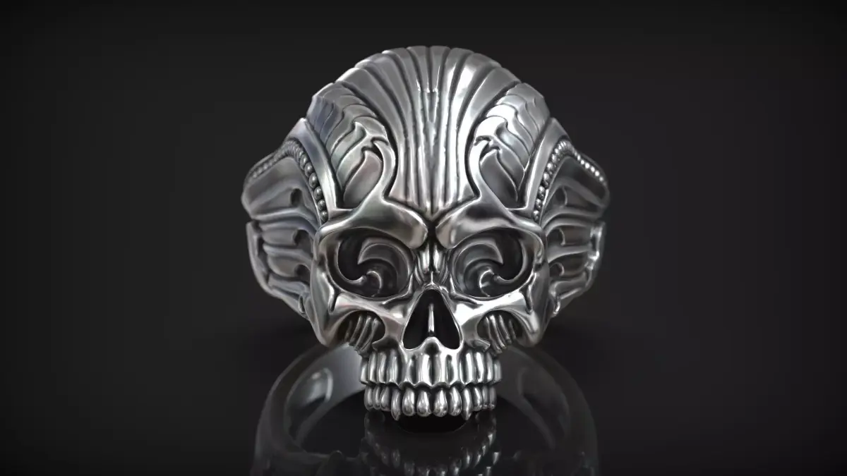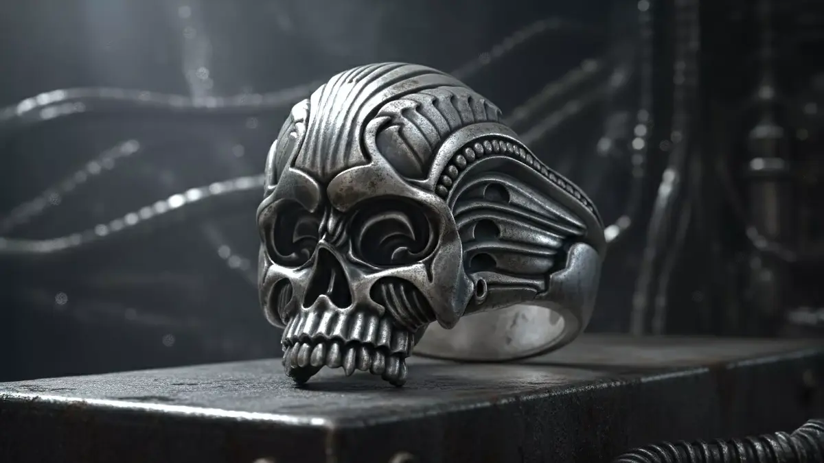 This 3D model presents a striking skull ring inspired by the biomechanical art of H.R. Giger. Designed in a bold biker aesthetic, the ring combines organic and mechanical forms into a darkly elegant composition. The skull is sculpted with flowing metallic ridges, intricate biomech engravings, and symmetrical structural patterns that give it a surreal, otherworldly appearance. Its high-polished metal surface reflects light dramatically, emphasizing every contour and detail. Perfect for jewelry designers, 3D artists, and fans of Giger’s biomechanical universe, this model embodies both power and precision, making it ideal for 3D printing or digital concept art.