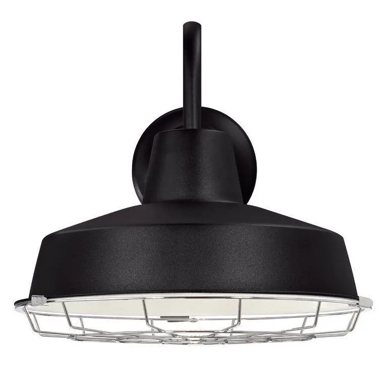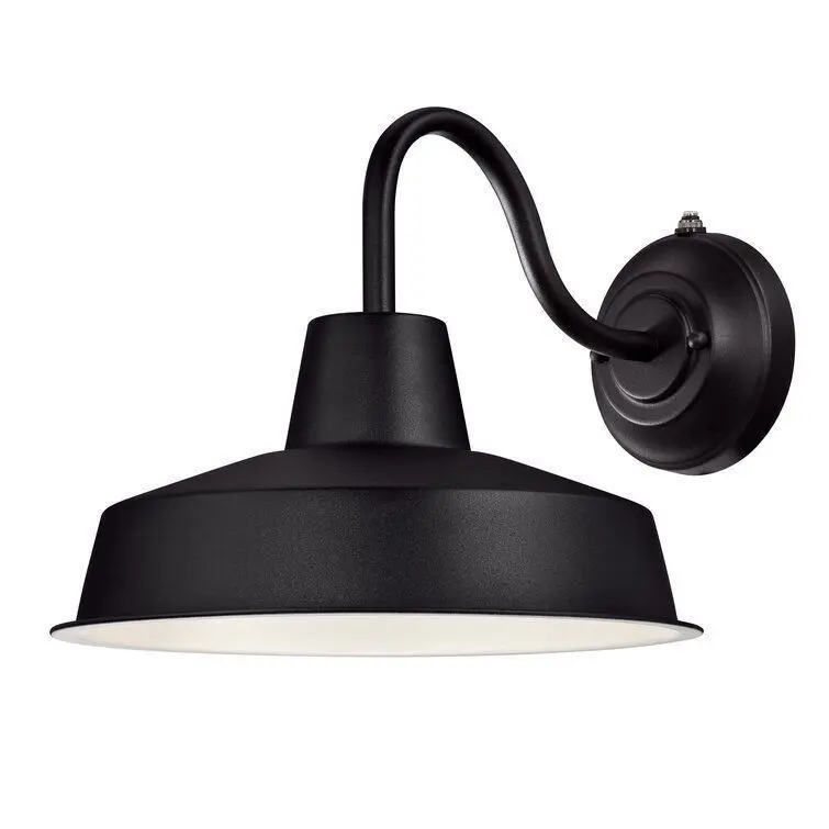 - Illuminate your patio or porch in a curated industrial style with this outdoor wall lantern. Crafted of metal in a weather-resistant painted finish, this fixture features a raised round backplate complete with tasteful mouldings and decorative screwcaps, while a curvy gooseneck arm suspends a wide-brimmed bowl shade in place