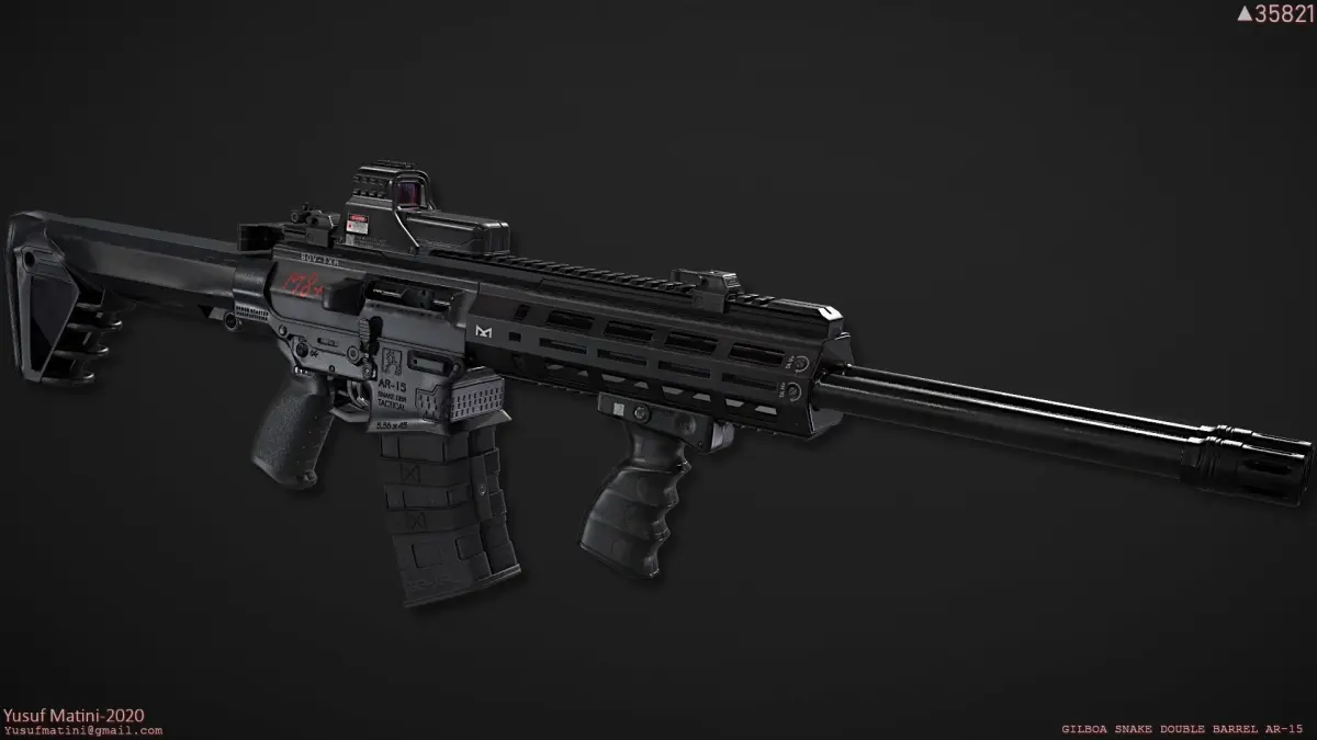 A double Barreled AR-15 with two triggers, two magazines and two buffer tubes.
