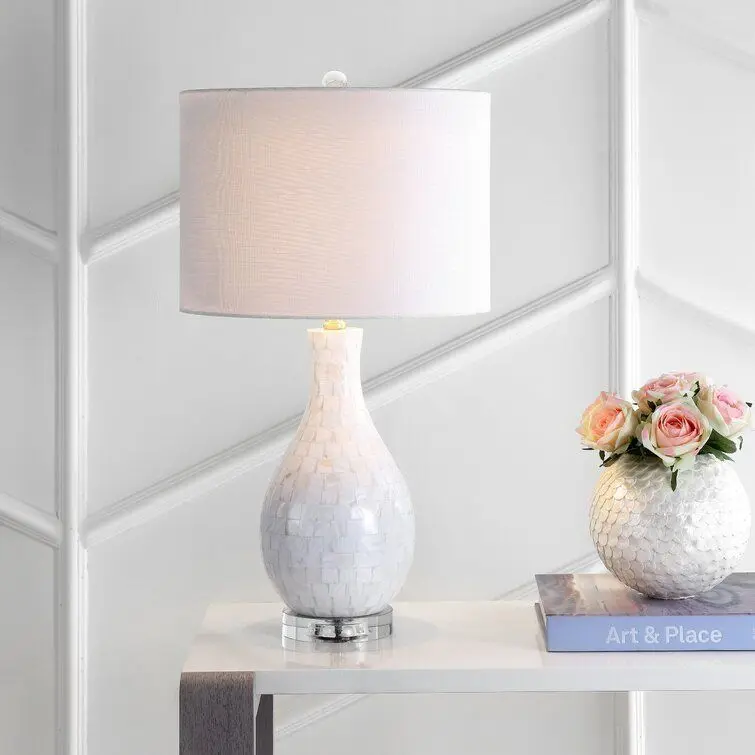 - Shimmering tiles of natural mother of pearl shell cover this magnificent, transitional table lamp. The vase-shaped base's fluid curves are punctuated by nickel and crystal accents. The cord is fully wrapped in silk, and a simple white fabric drum shade diffuses the light while keeping the focus on the glamorous shell tiles.