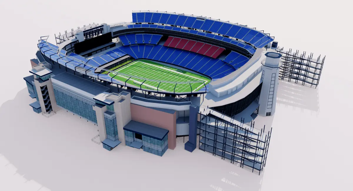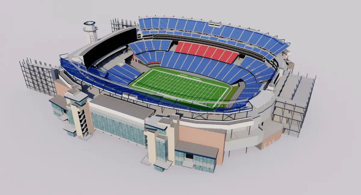 Model created with NFL pitch. Possibility of creating another sport inside. Ask before buying. Starter model.Approximate dimensions. Bleachers and seats in 2D texture. Render setup not included.