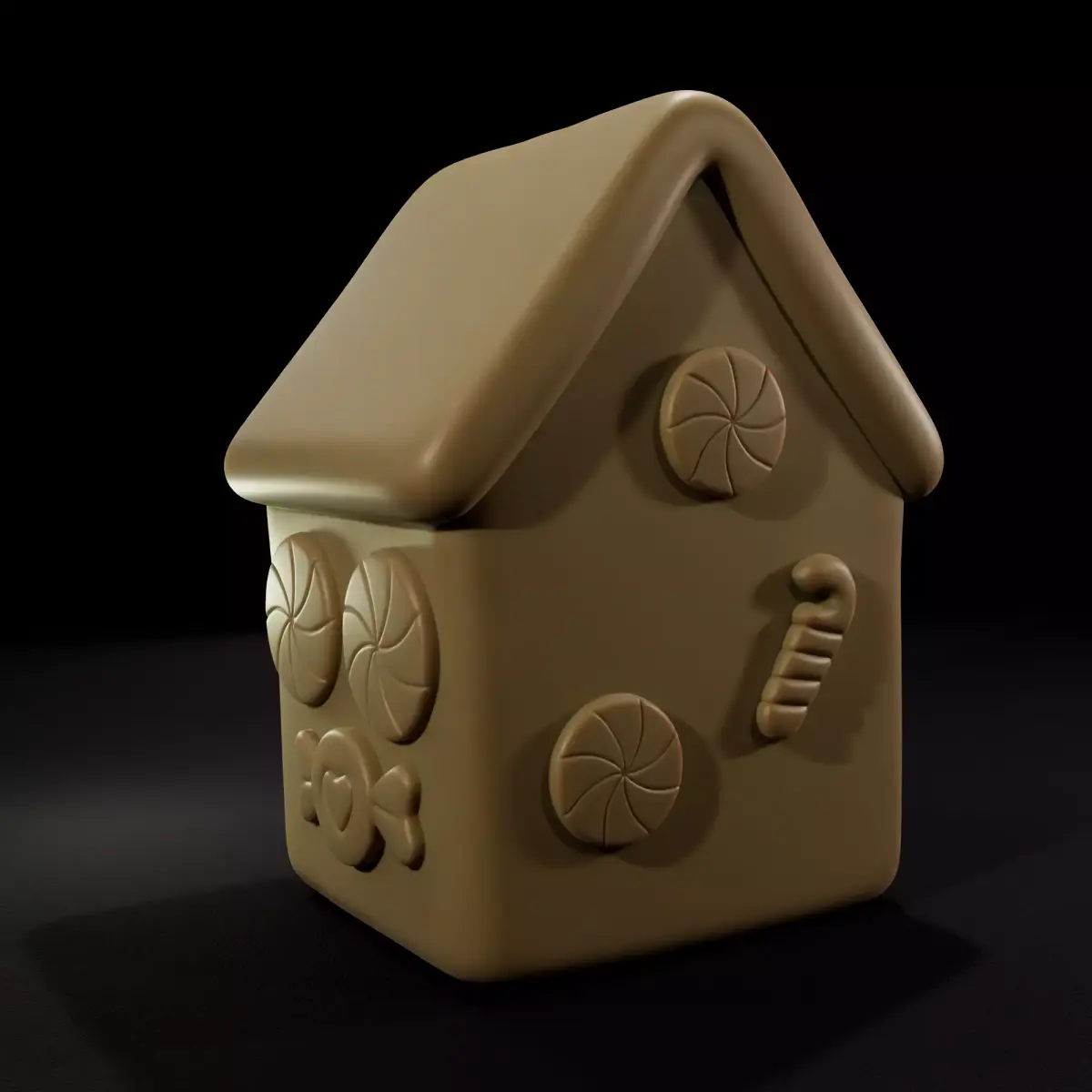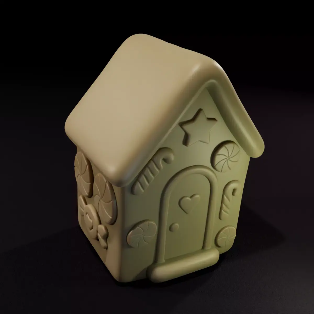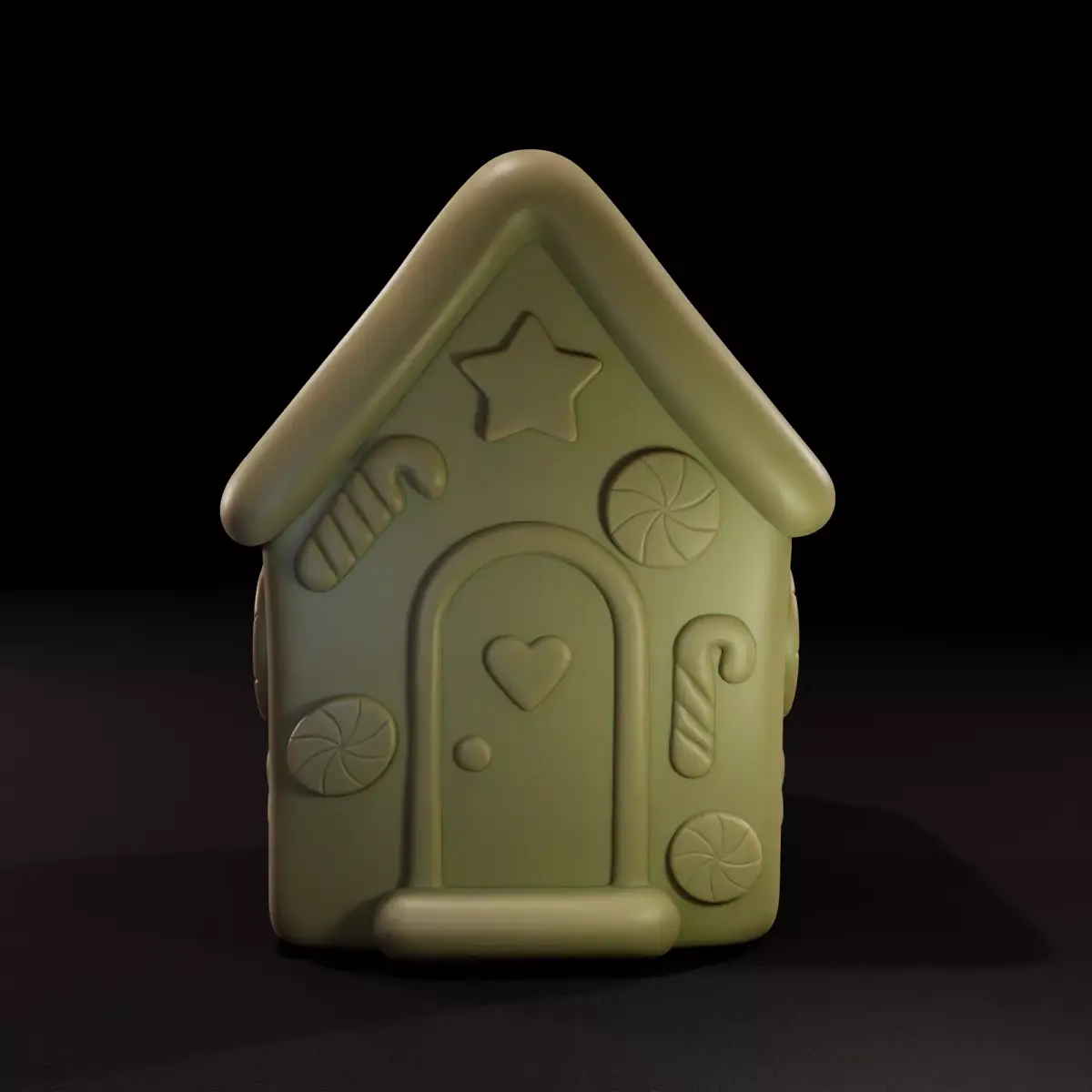 Una encantadora y robusta casa de jengibre con un diseño de estilo juguete o chibi, caracterizada por sus formas suaves y redondeadas que imitan el glaseado y la pastelería. La estructura es una silueta de casa tradicional con un techo a dos aguas y una base gruesa. La fachada está ricamente decorada con relieves navideños de gran tamaño y visibilidad, incluyendo una puerta central con un corazón, caramelos de bastón (candy canes), remolinos de piruletas y una estrella sobre el tejado. El modelo es sólido y visualmente apetecible, ideal para una temática de dulces navideños.
