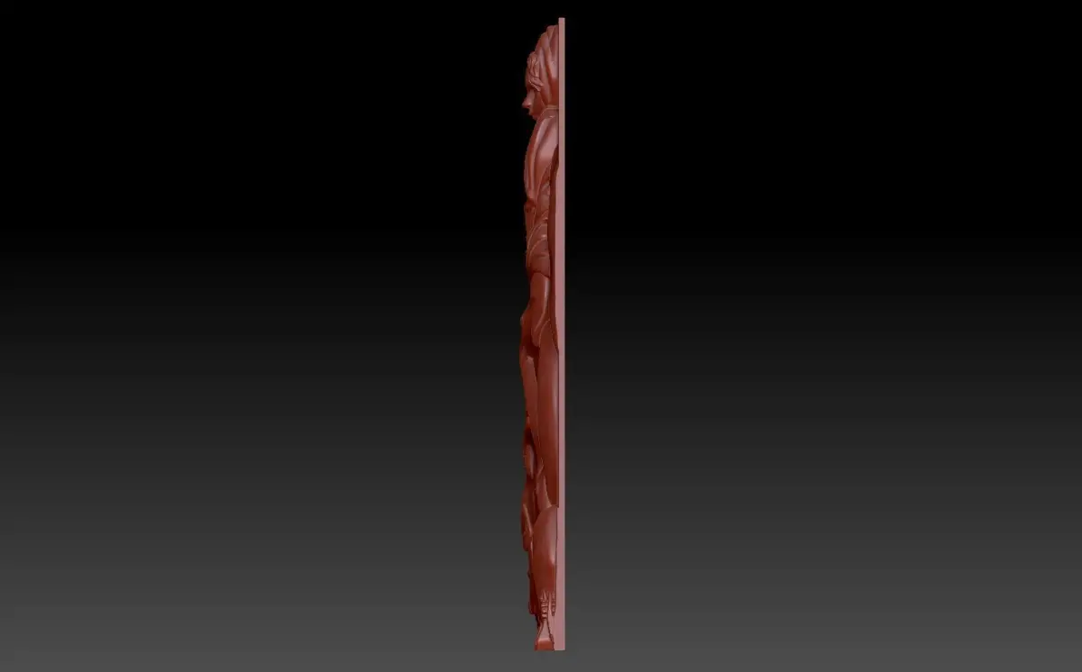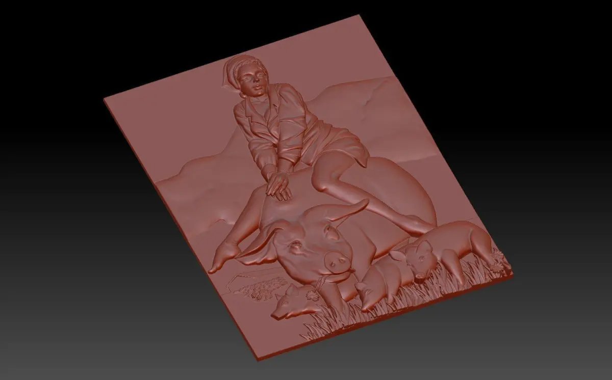 A 3D bas-relief model depicting a girl sitting on a pig. Her direct and attentive gaze immediately attracts attention. This job is ideal for both 3D printing and CNC machining.