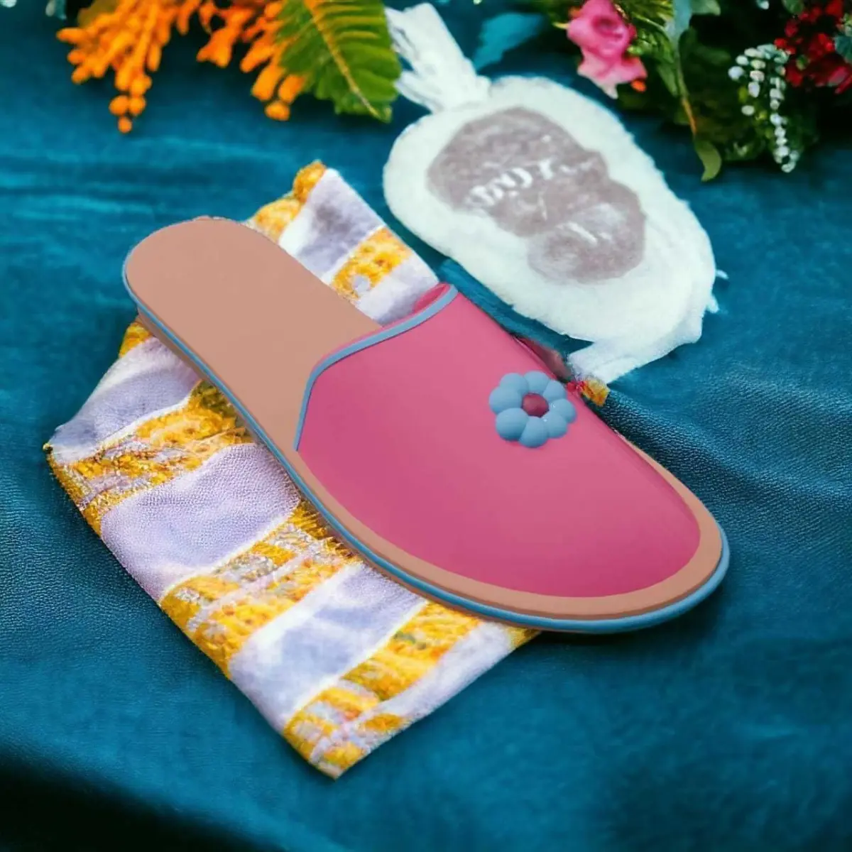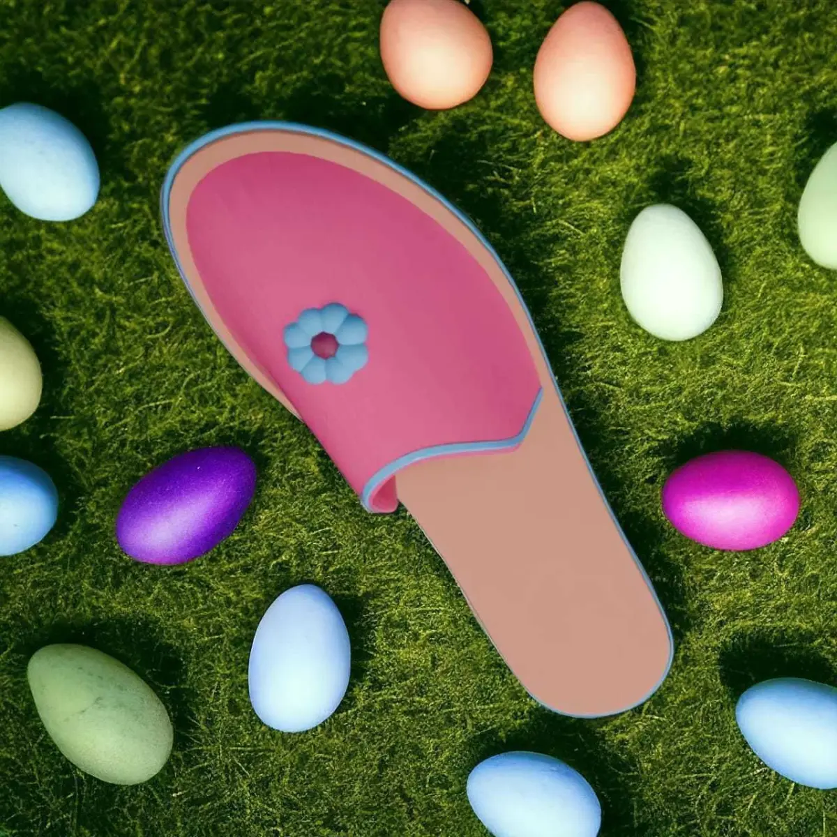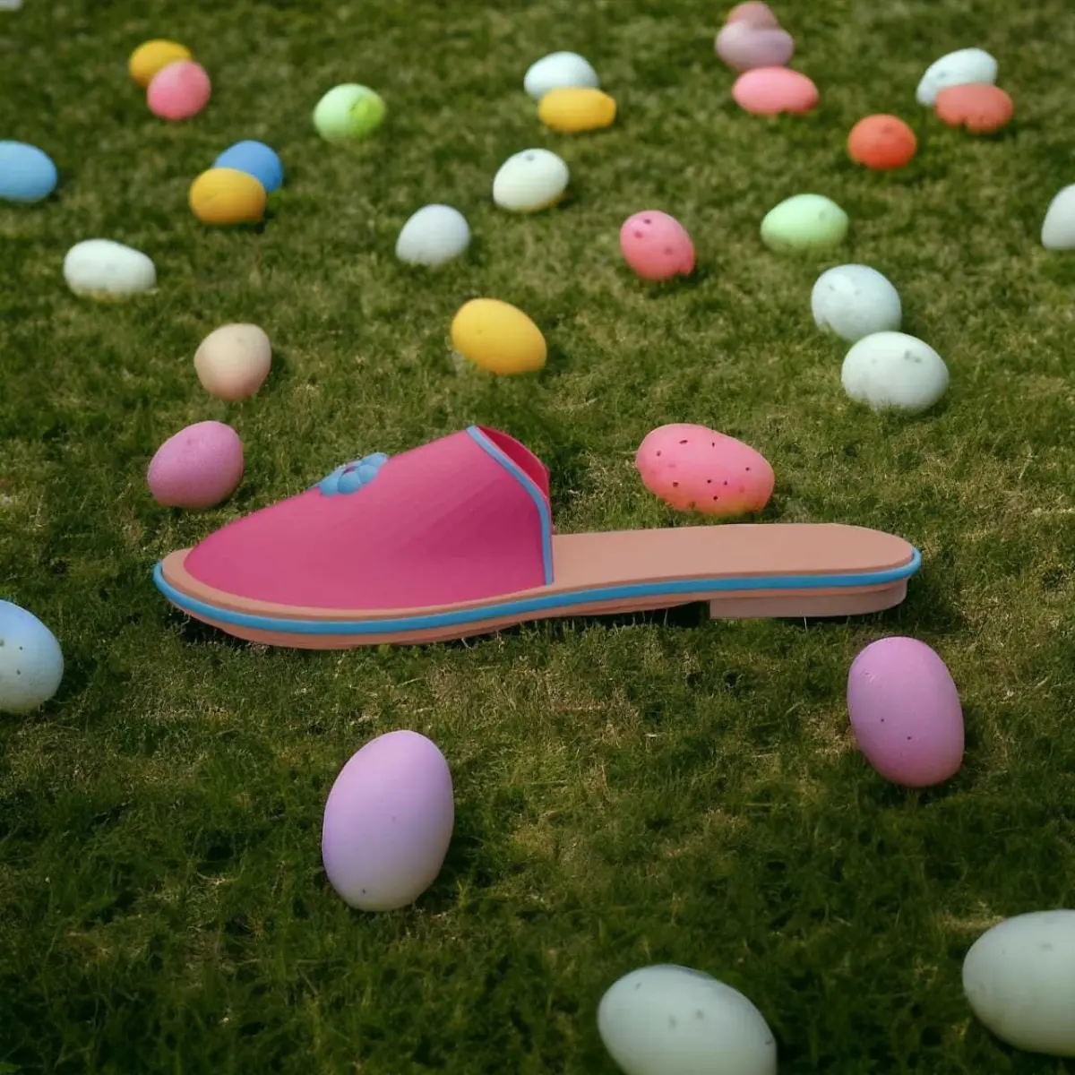 This delightful digital design features a whimsical spring scene. At its center, a pink slipper with a light blue interior and a charming blue flower near the toe area takes the spotlight. The slipper rests on lush green grass, surrounded by a collection of colorful pastel eggs in shades of purple, pink, blue, green, and yellow. The composition exudes a festive and playful vibe, making it perfect for seasonal promotions, Easter celebrations, or as an eye-catching graphic for springtime events.