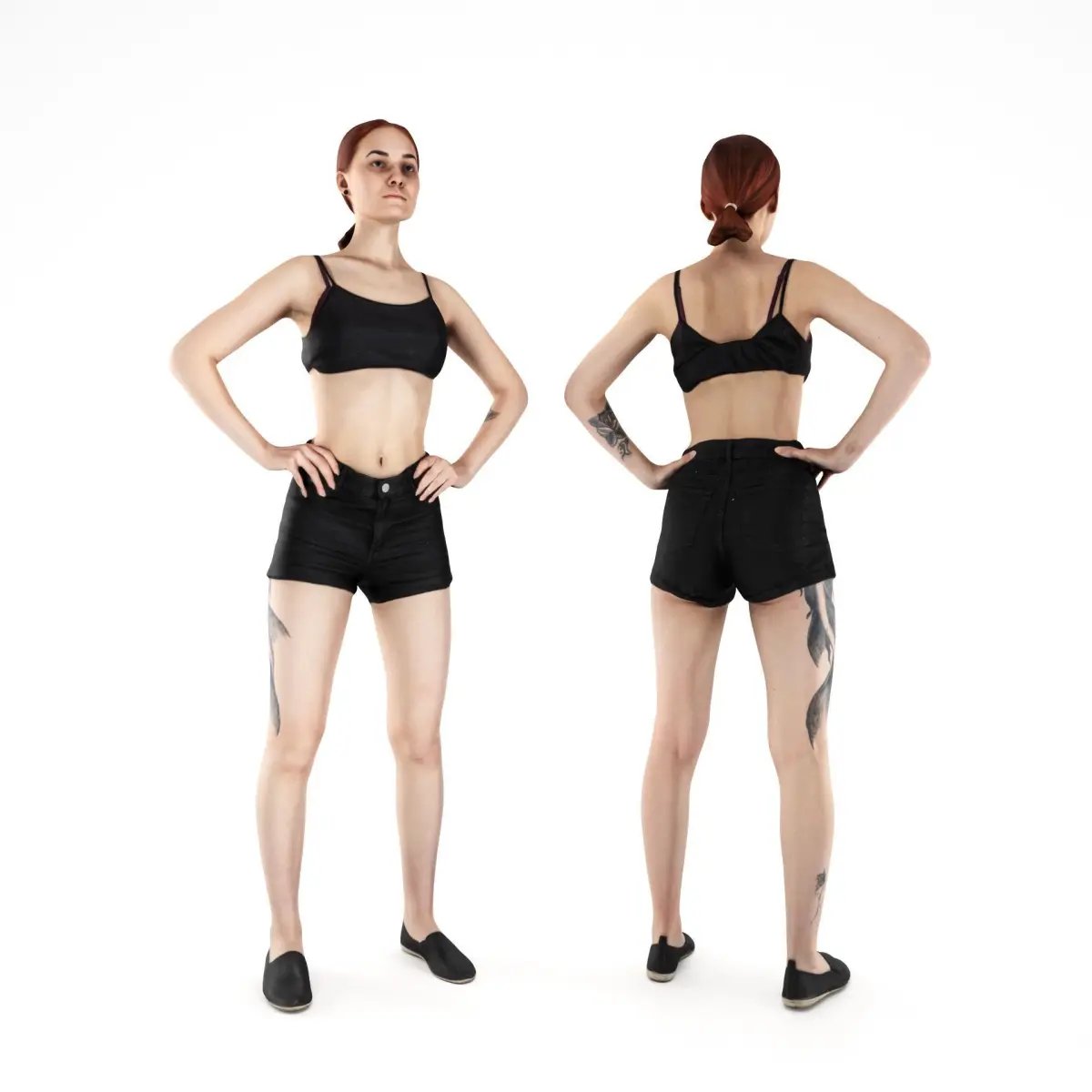 This is a true human size and detailed model of a sporty beautiful young woman of Caucasian appearance. The model is captured in casual pose to be perfectly matching for variety of architectural visualizations, e.g. sport ground, gym, beach, etc.