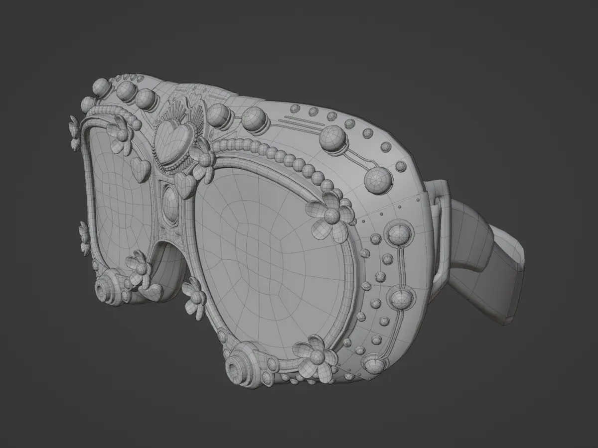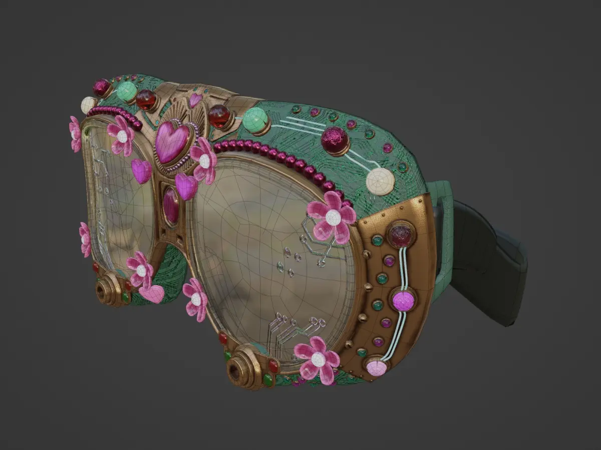 Highly decorative and unique cyberpunk goggles for girls.The goggles feature green and gold frames adorned with pink flowers, heart decorations and various colored beads and gemstone. Blue glowing rings surround the lensesThese goggles are perfect for fantasy and cyberpunk projects.