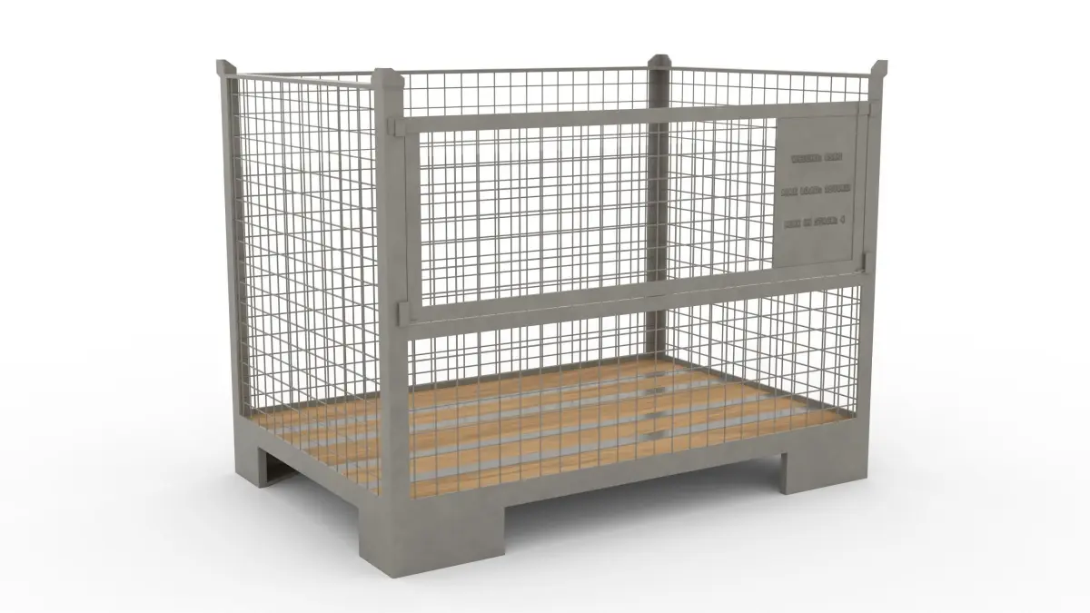 There's two different objects - low profile blue gitterbox and standard size gitterbox with 3 different textures. Dimensions are 1252x850 X/Y and 970mm height for standard and 600mm for low profile.