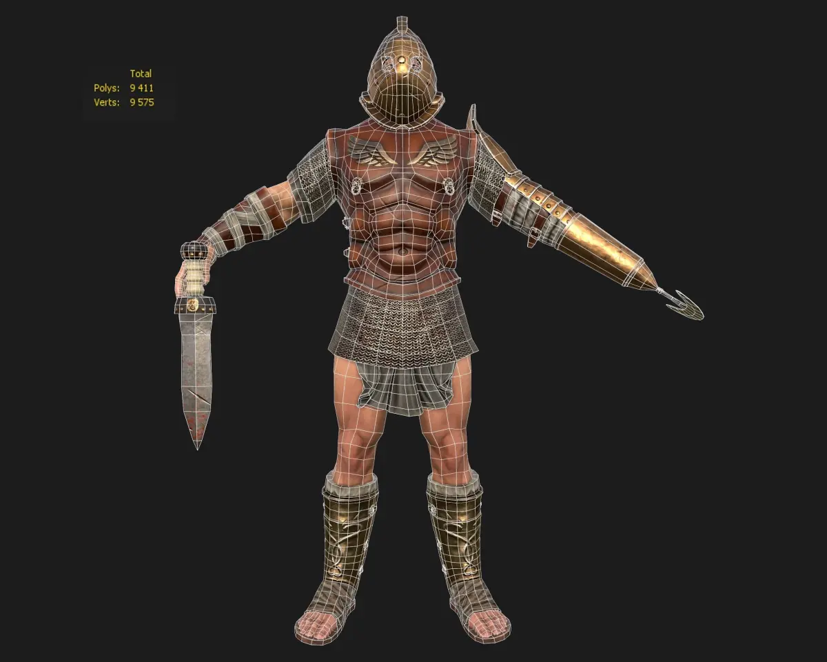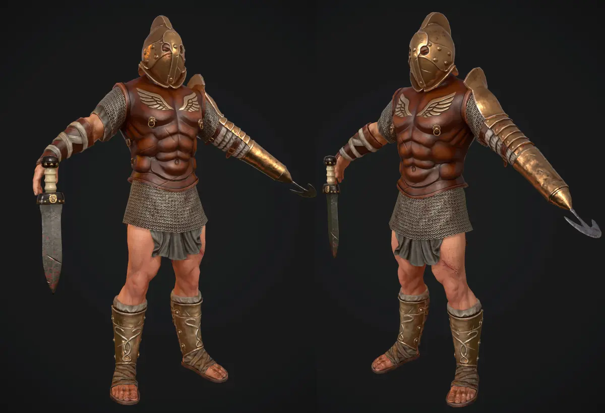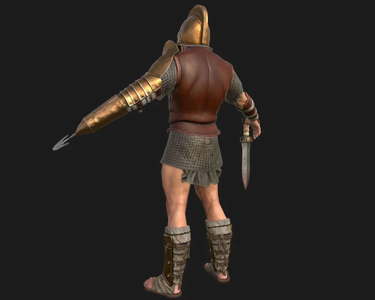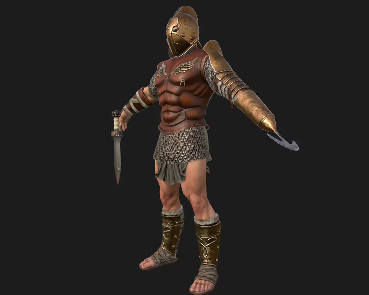 Realistic low poly model of gladiator ready for Virtual Reality (VR), Augmented Reality (AR), games and other real-time apps. Model with weapons and armor has 9,431 polygons, 18,436 triangles and 9,575 vertexes. 5 texture 2048x2048 maps in tga: diffuse, roughness, metalness, normal, ambient occlusion.Available File Formats: -FBX