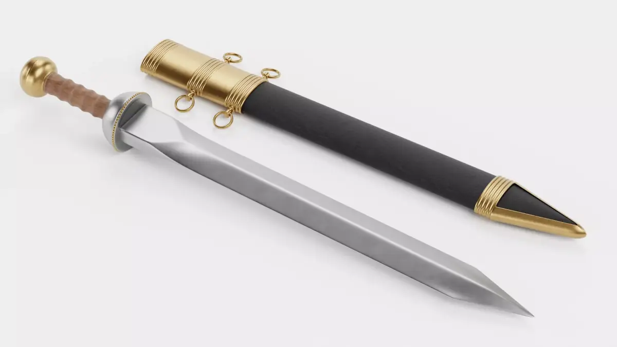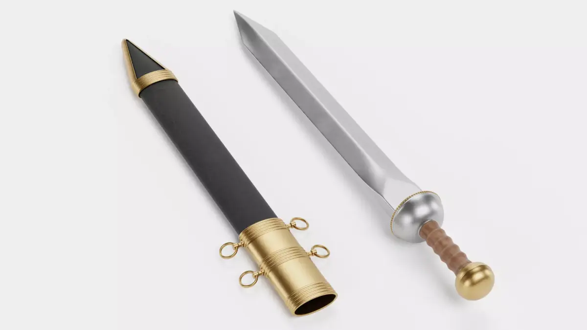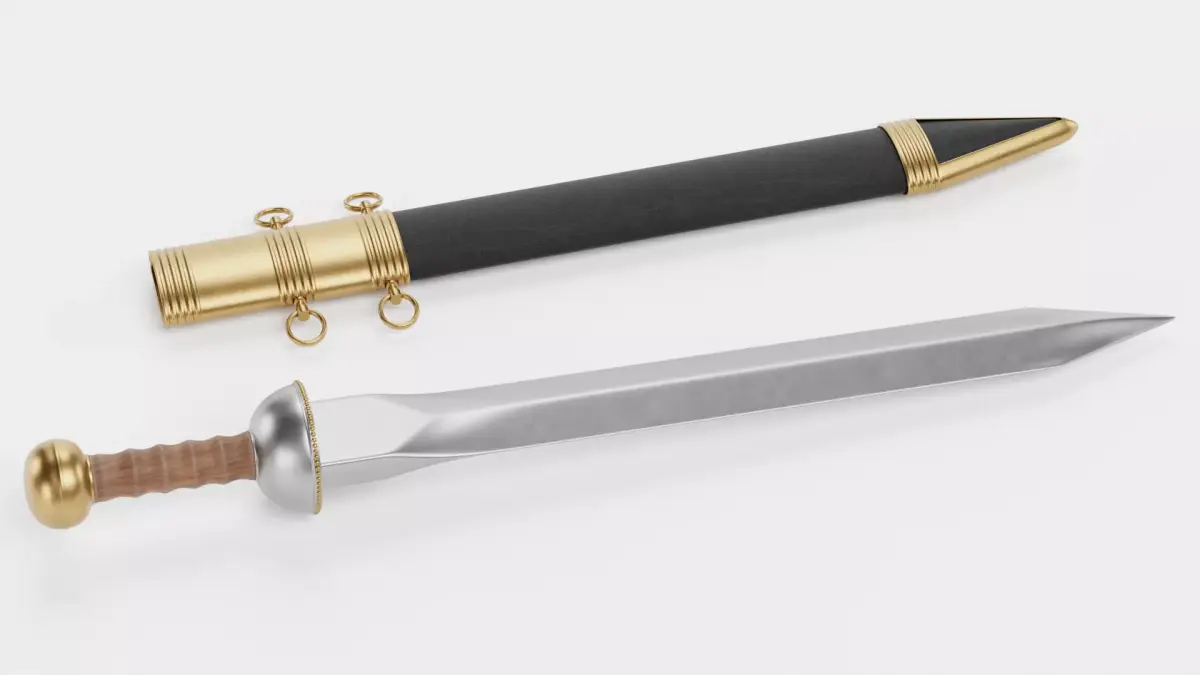 Two-piece 3D set consisting of a Roman gladius and a matching sheath. The sword features a polished silver blade paired with a gold-toned handle, while the sheath combines a dark, near-black body with gold decorative accents. Both models are precisely aligned so the blade fits into the sheath, maintaining accurate historical proportions and clean, production-ready geometry.