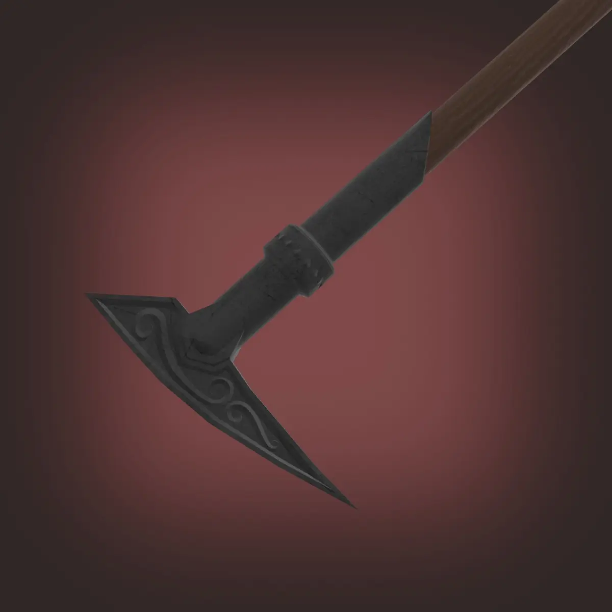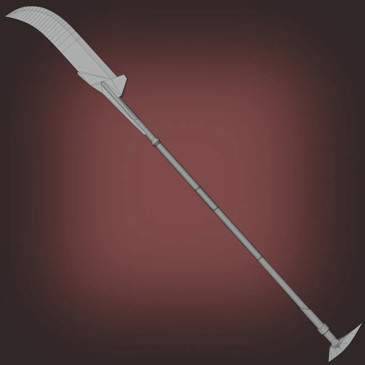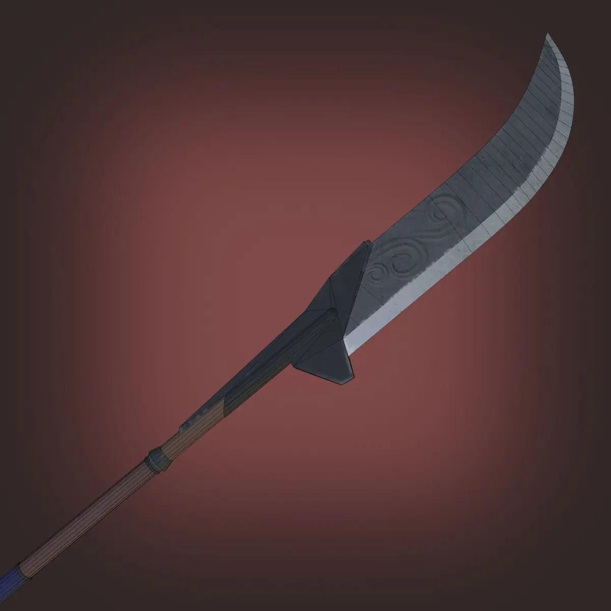 A glaive with a large blade with a piercing part at the bottom.Leather for a comfortable grip is present.The length is about 2 meters.The normal map is present.The UV scan is present.