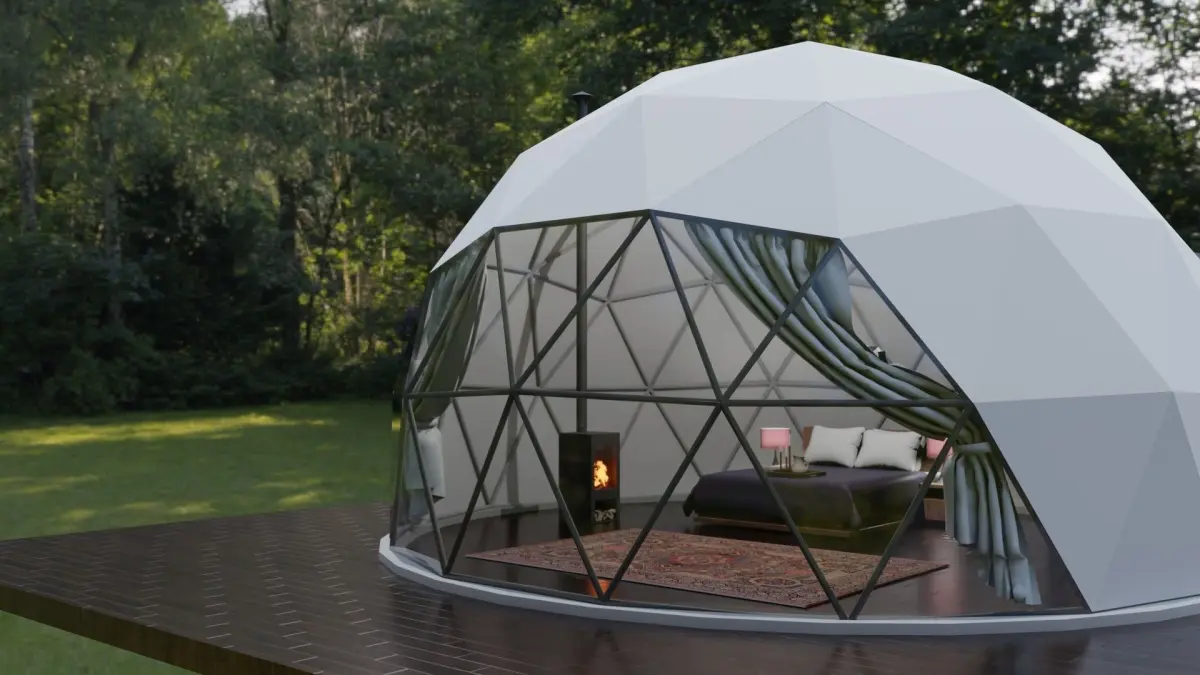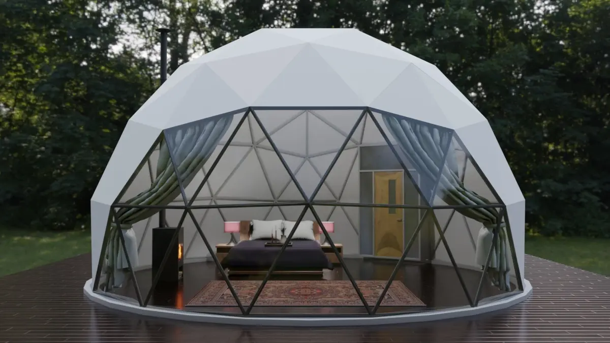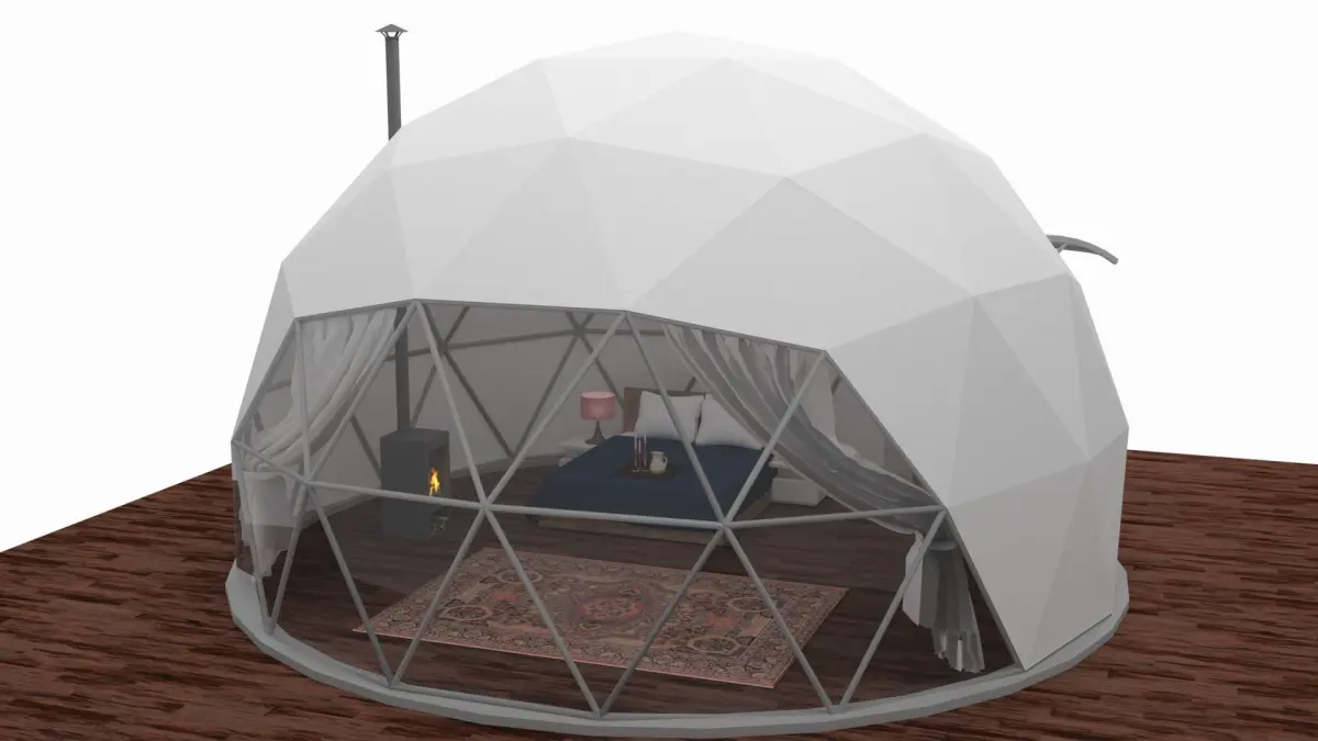 This is a Glamping Dome Relistic with steel structure.3ds Max and Vray. Blender and CyclesThe plan area is 8.24m radius and height is 5.04m