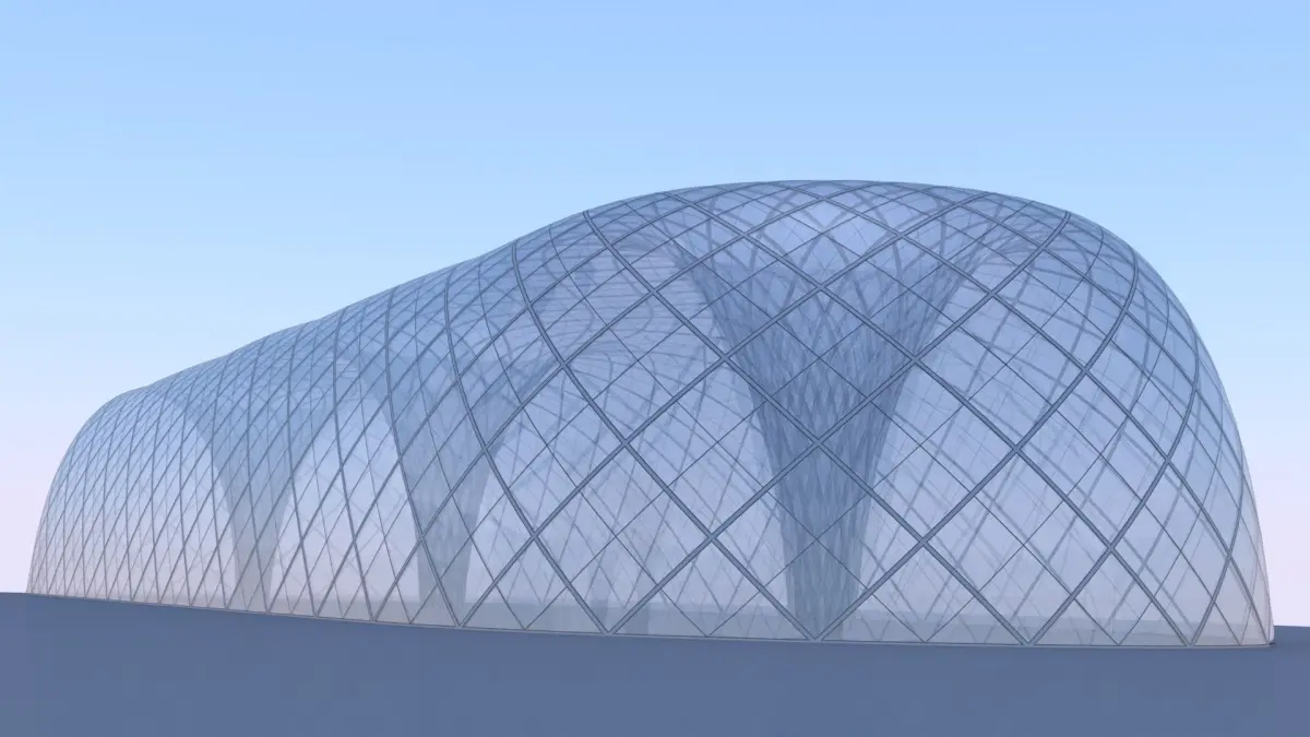 - This is 3D model of futuristic glass building.