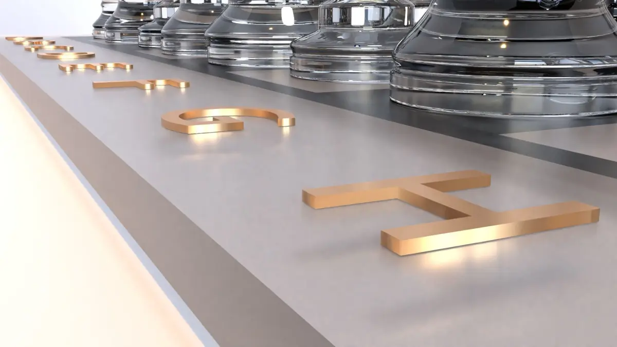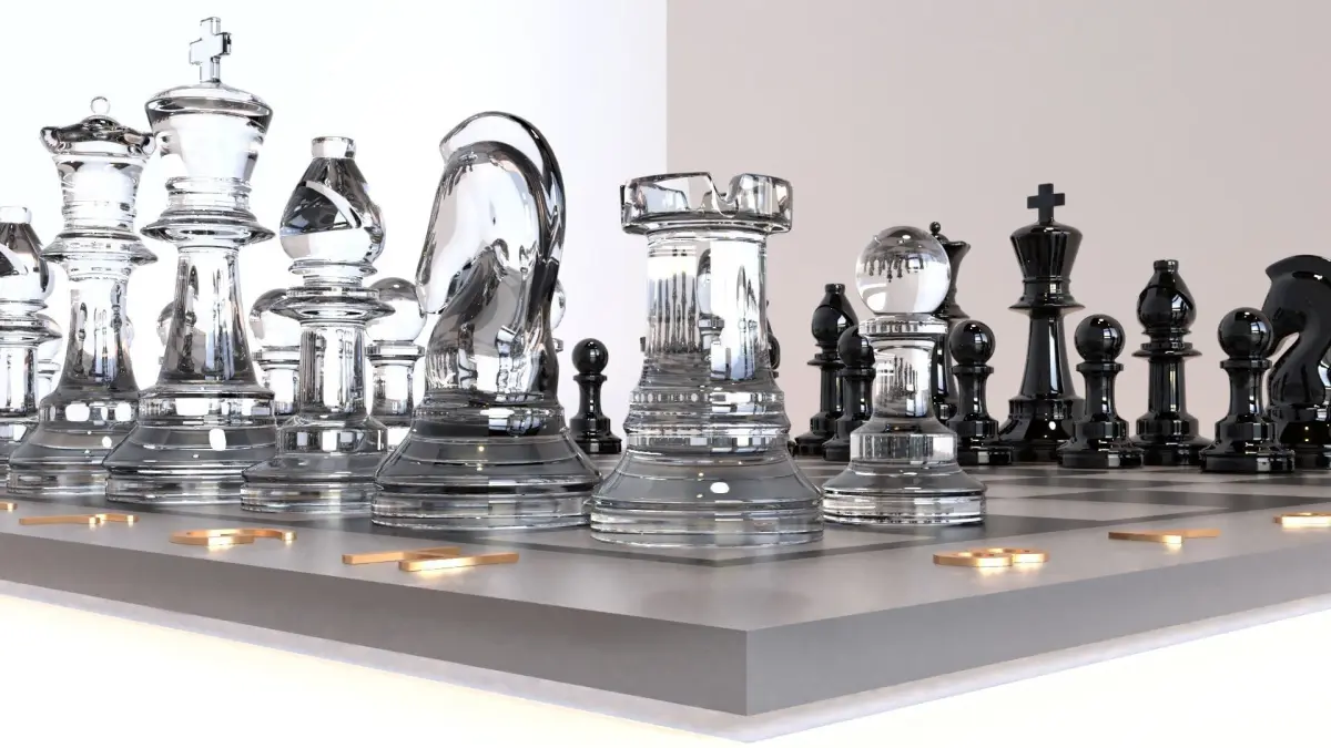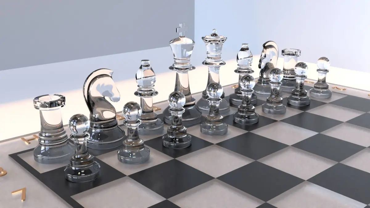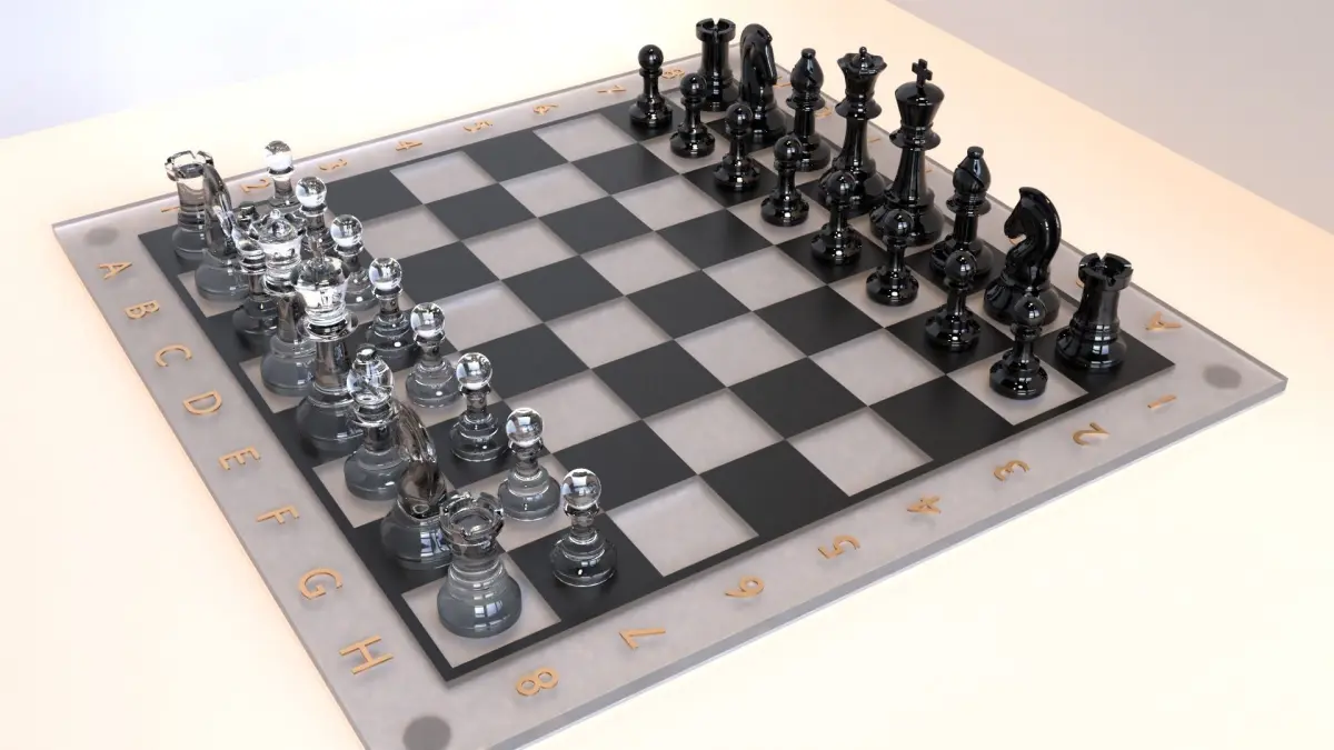 The glass chess set include all the pieces board. The pieces have realistic glass material on them, the board has frosted glass material and the letters and numbers have a gold material. On the bottom of the board are round pieces of felt(felt material).
