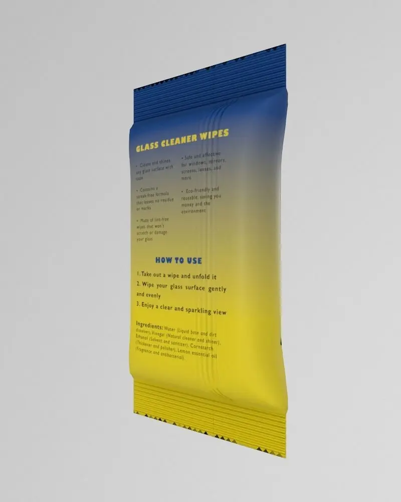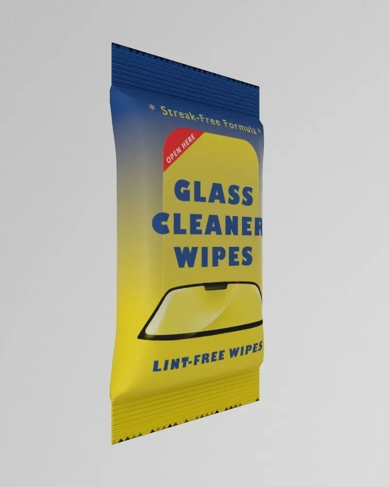 Glass Cleaner Wipes: These convenient glass cleaner wipes come in a resealable pack, making them perfect for on-the-go cleaning. The packaging features a bright yellow color scheme, with a graphic of a crystal-clear windshield. The label includes the text Streak-Free Formula and Lint-Free Wipes. Each wipe is pre-moistened with a powerful glass cleaner that effortlessly removes dirt, fingerprints, and smudges from your car's windows.