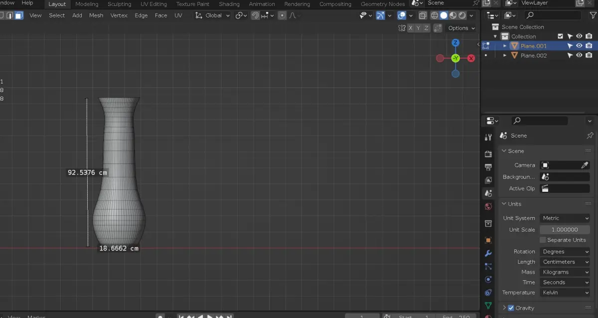 Total vertices: 1774. Height: 92.5 cm, bottom diameter: 18.6 cm, body diameter: 33.7 cm, Top hole diameter: 26.2 cm as shown in sceenshot.