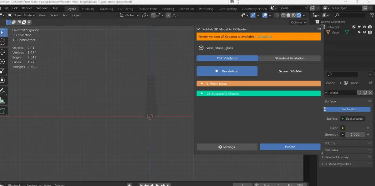 Make sure quad only, no N-gon, no triangulates, no vertice with more than 5 edges in model, no UV overlapping, no stretch UV as per CG trader standard, other parameters were verified by Kodama. I also attached screenshot of verification by Kodama for the model.