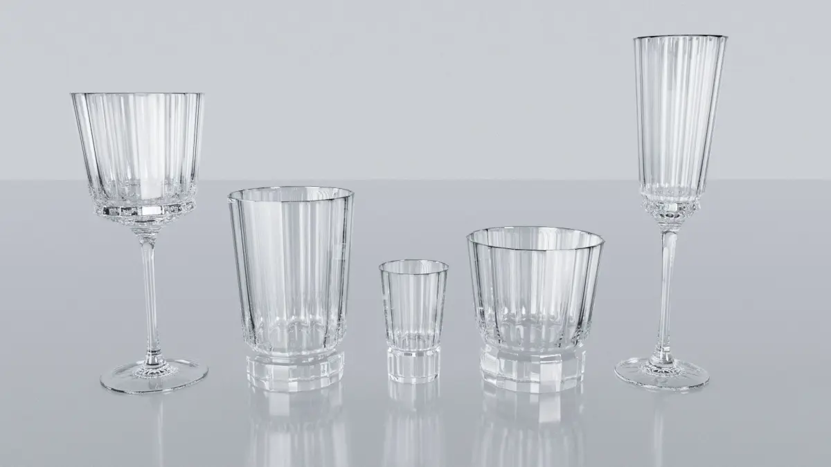 This set contain 8 different models. Decanter, Ice Bucket, Bowl, Champagne Flute, Shooter, Wine Glass, Whiskey Glass, Tumbler.