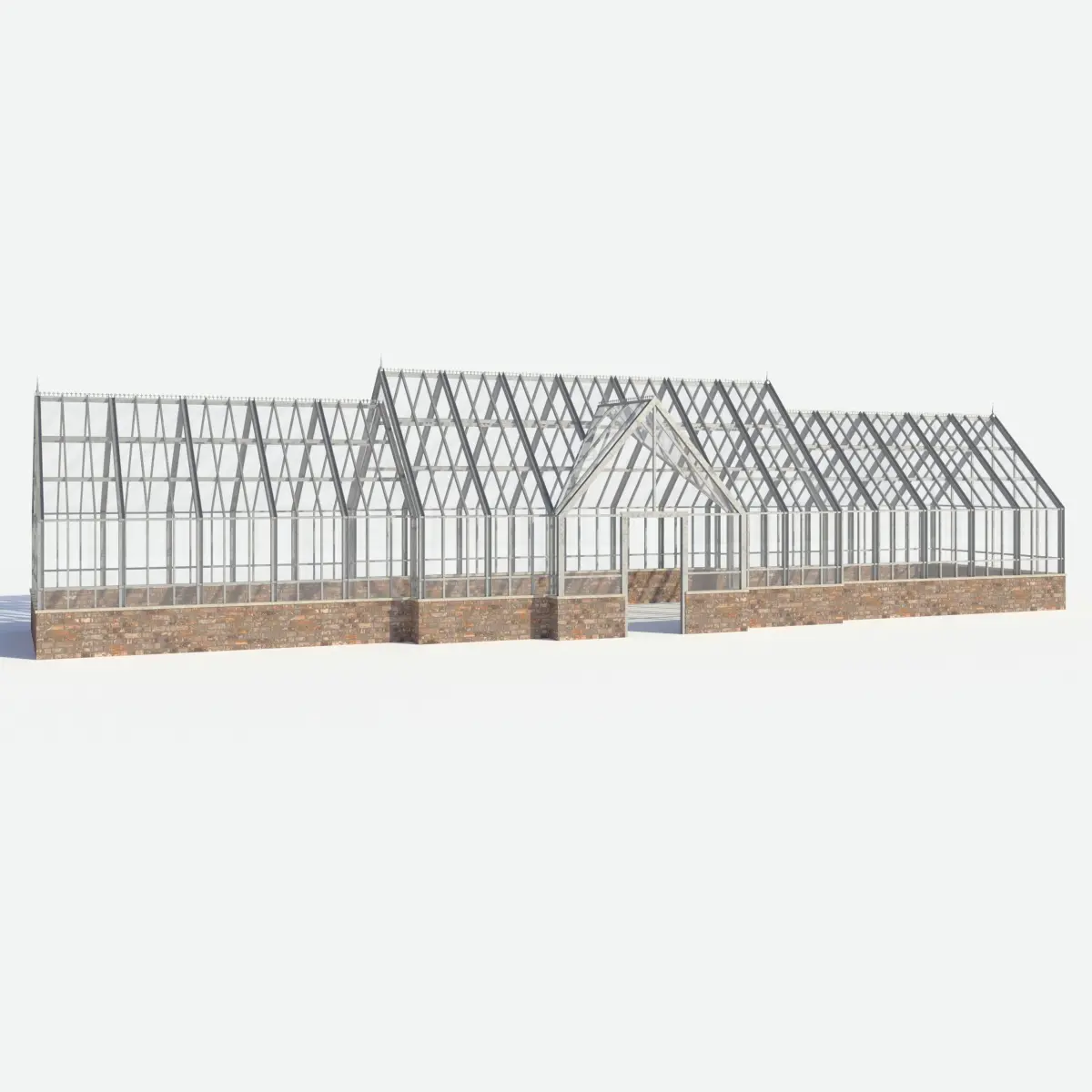 A large steel-frame and glass glasshouse with a brick plinth for garden and landscape visualisations. The design is a classic Victorian style, suitable for formal gardens and landscapes and large country estates. There are roof finnial details as well as ridge decorations.