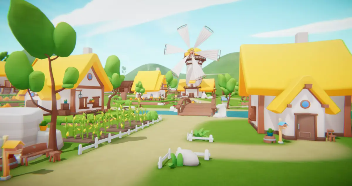 Step into a bright and charming countryside village, filled with golden rooftops, lively farms, and gentle rolling hills.