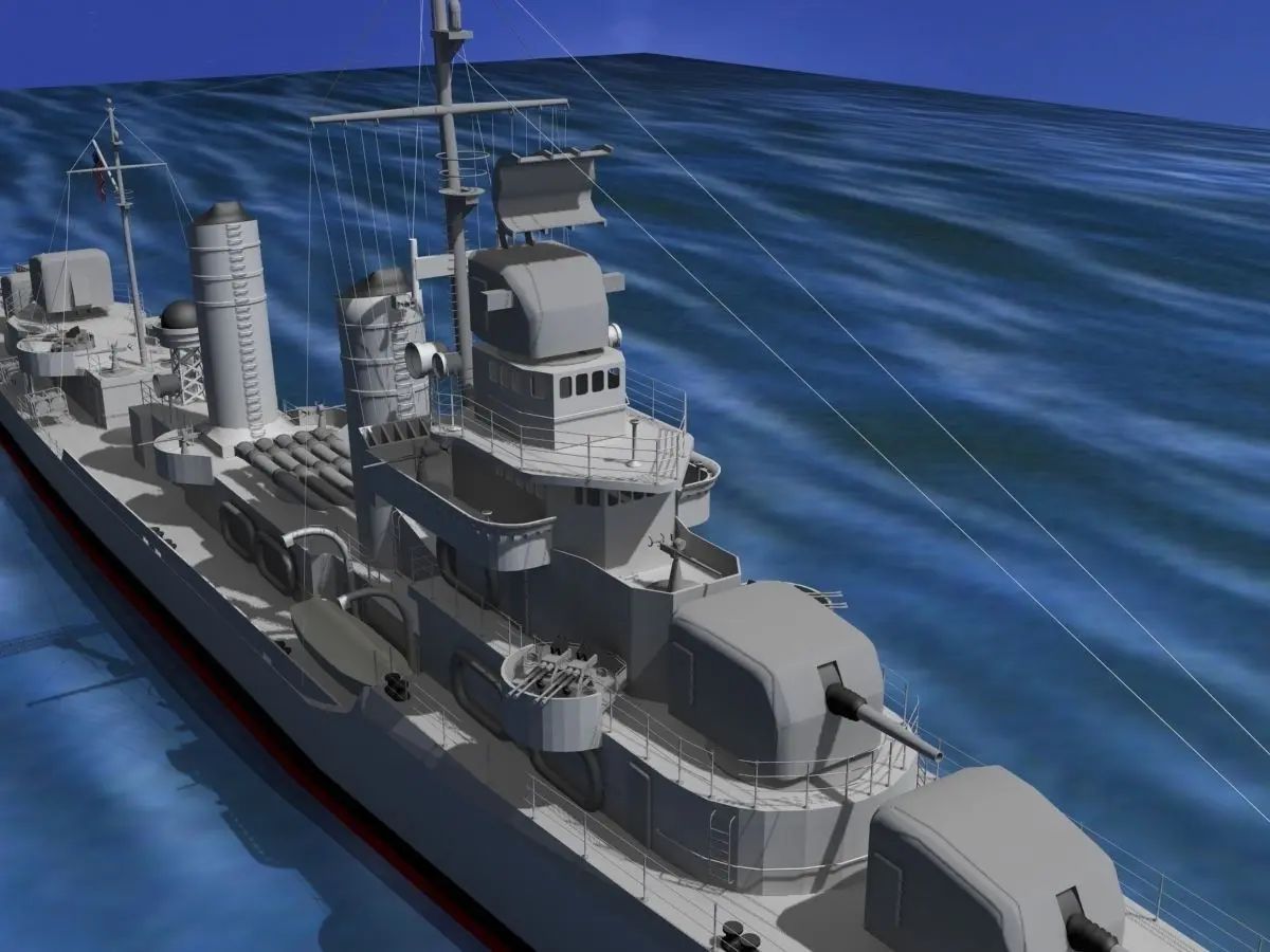 The model is very detailed. It includes many animateable features: guns and turrets, anti-aircraft borfors, 20mm cannons, davits, whaleboats, hatches, propellers and rudders. Flags can be easily added and animated. Anchors can be animated with the addition of anchor chains. Handrails, ladders and hatches appear through the model. Life Rafts are included through the model and can be launched. This model was built with textures and is available in multiple formats. These models render very well and look very realistic using good animation and rendering technique.