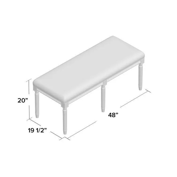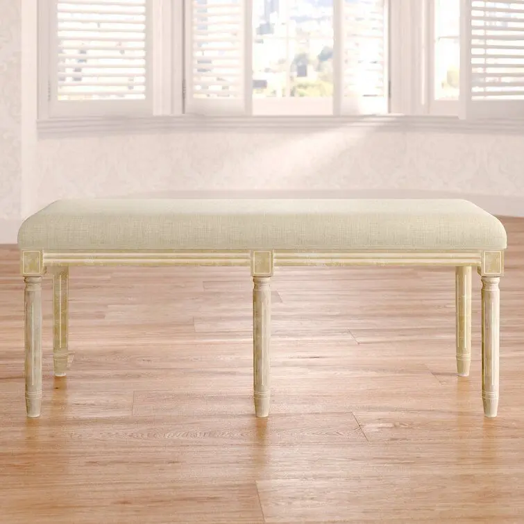 - Put an antiqued twist on your ensemble with this classic bench. Crafted from wood, its frame is founded atop four fluted legs and features carved details all finished in weathered flax. Up top, its cushion is wrapped in upholstery with a neutral solid hue for versatility. It's the perfect size for placing by the front door or sitting at the foot of your bed.