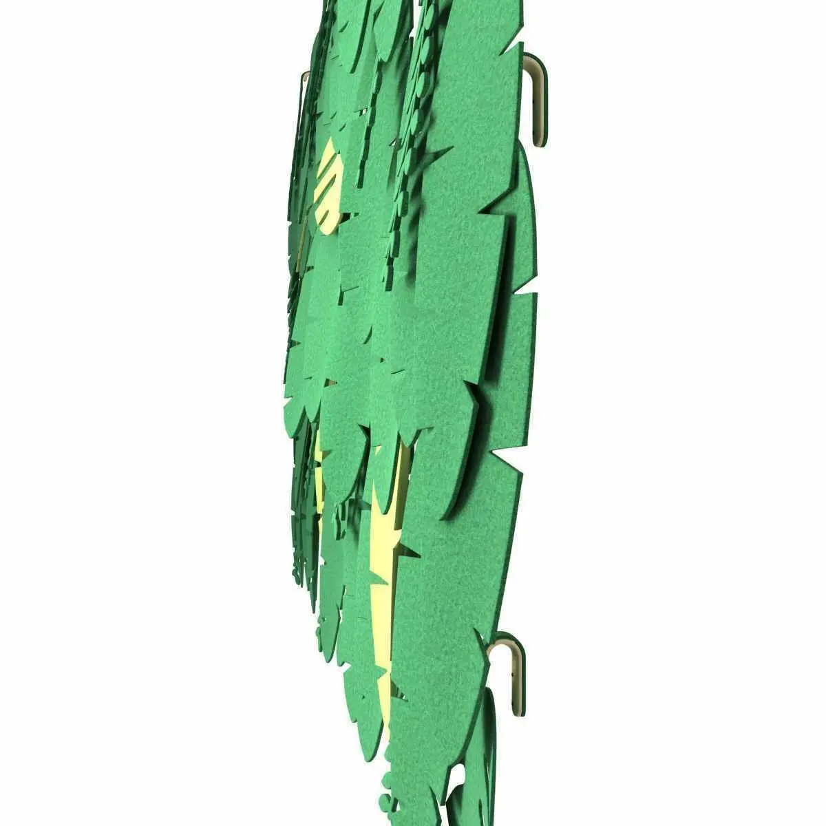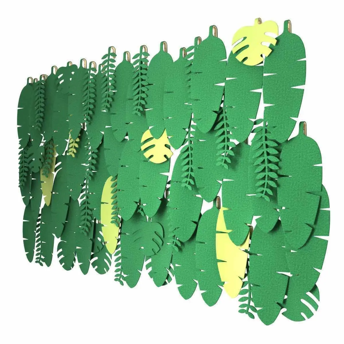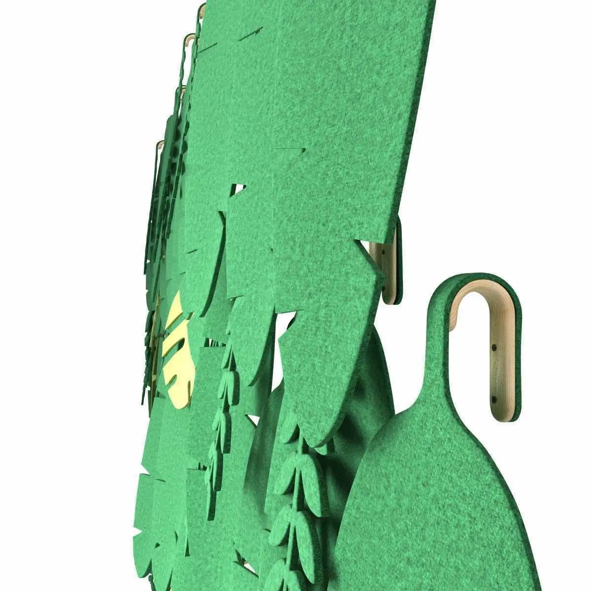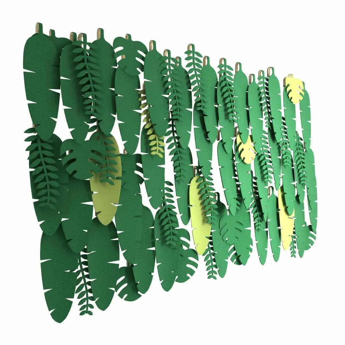 Name of product/article JUNGLEWALLType Fabric Decorative acoustic panelMaterials FeltJungleWall is a series of sound absorbent leafs in different patterns. The material is made of felt and the leafs can be mounted in a way that creates a distance to the wall. In addition, the material in JungleWall, along with the distance to the wall, creates a good prerequisite for sound absorption. JungleWall is advantageously used in large quantities in a workplace / public environment like a background wall.