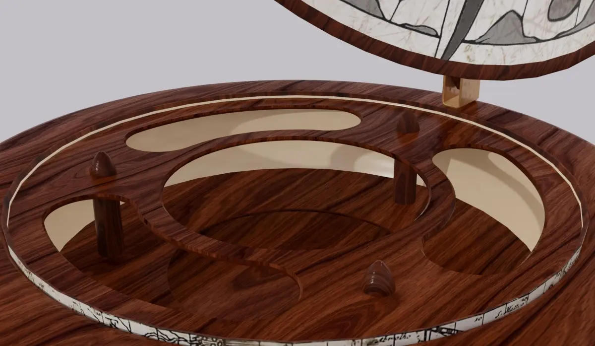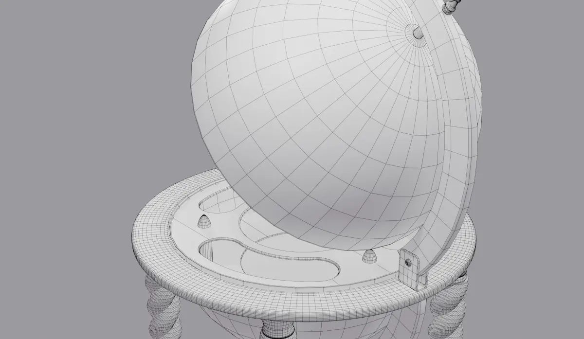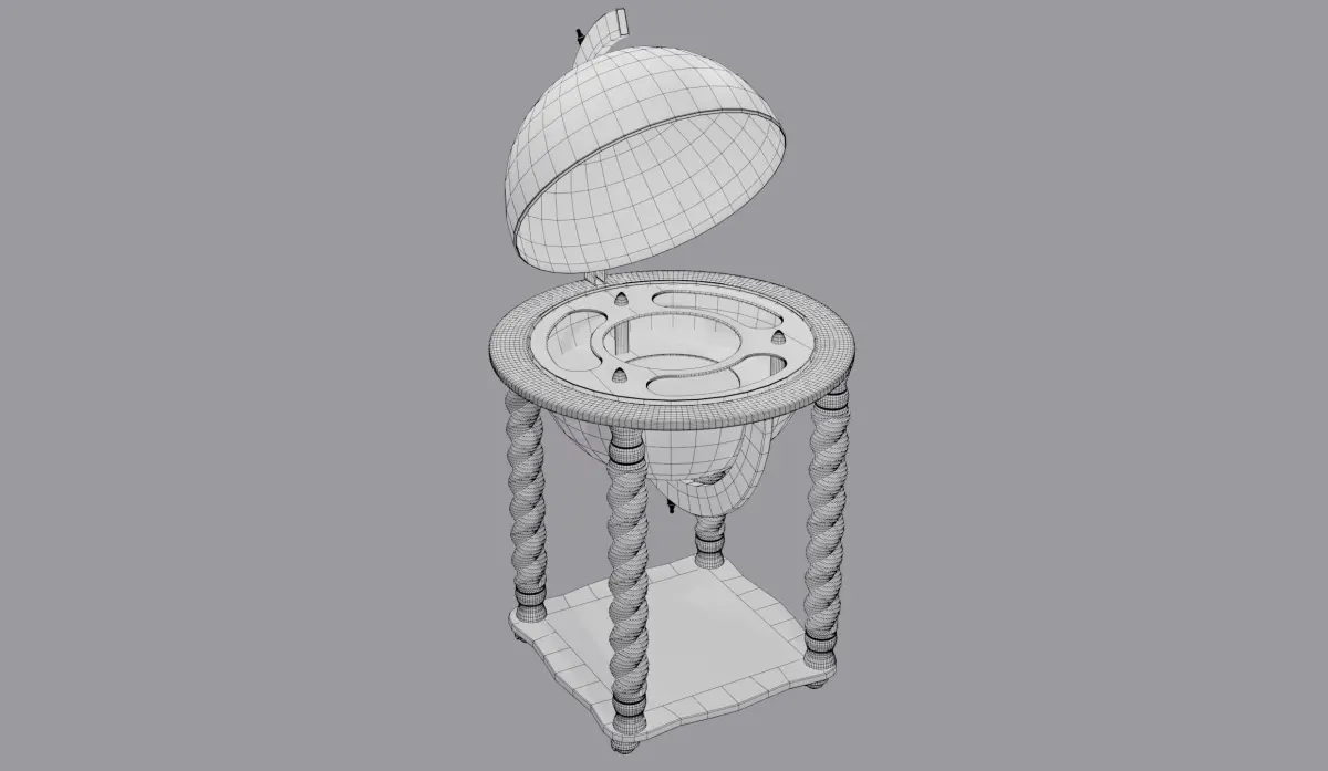 The base is made of dark wood. Inside there is a space for alcohol or other items. You can also place items on the bottom shelf. The upper part of the hemisphere is a single object centered on the axis of rotation, so that the lid can be opened and closed by rotating around the Y axis.