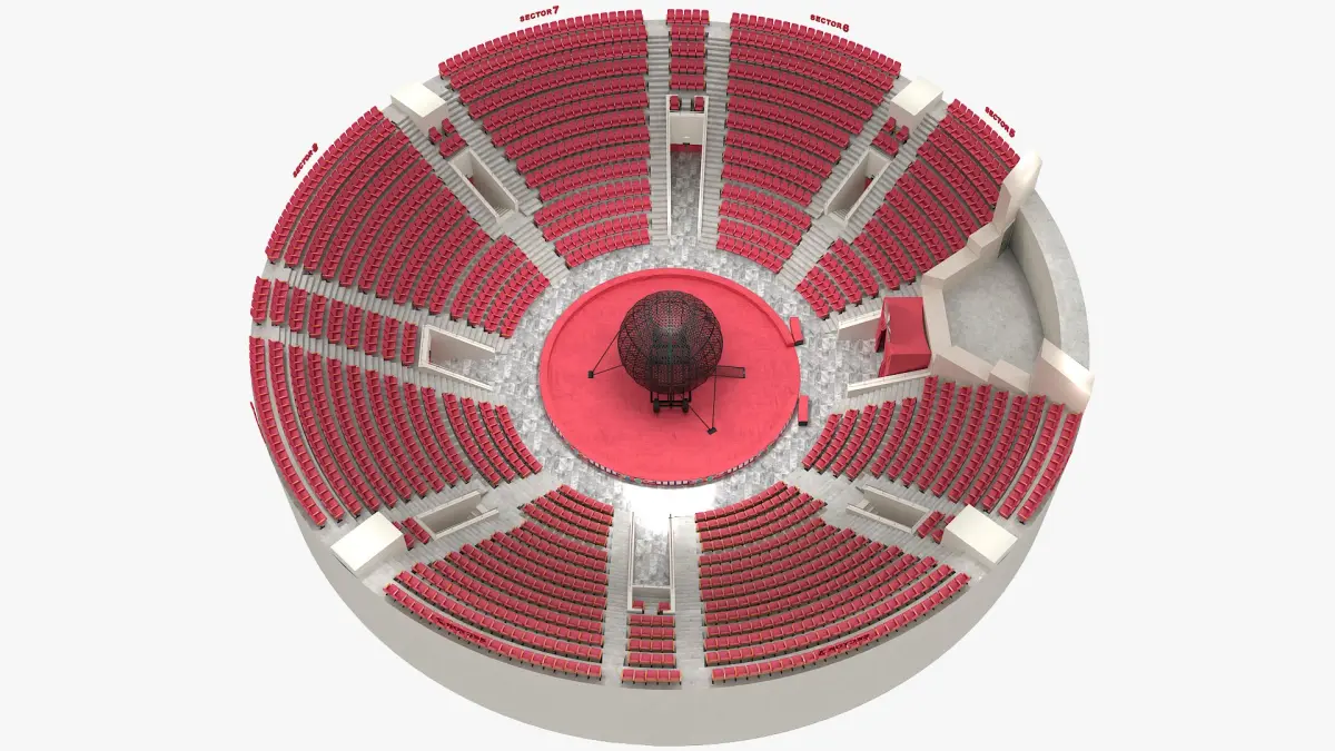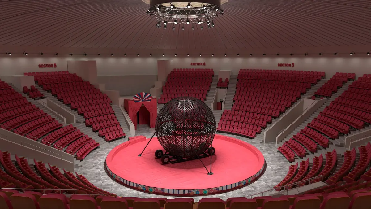 This model showcases a detailed arena with tiered seating for viewers, a central circular stage, and a large metal globe designed for thrilling motorcycle stunts. The vivid colors and realistic structure make it perfect for visualizing the dynamic environment of a live-action circus performance.