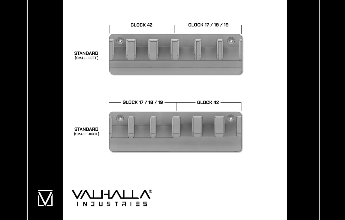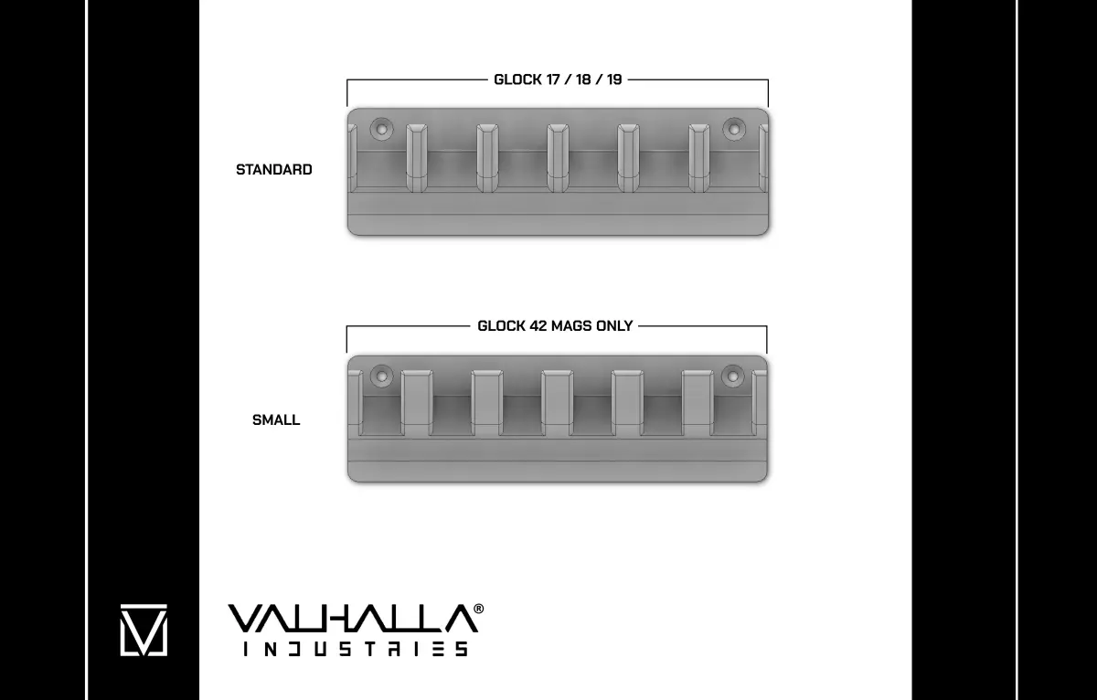 Glock Mag Rack (Small Left), for 3 standard sized Glock mags on the right side and 3 small Glock 42 mags on the left side.
