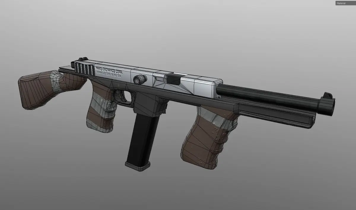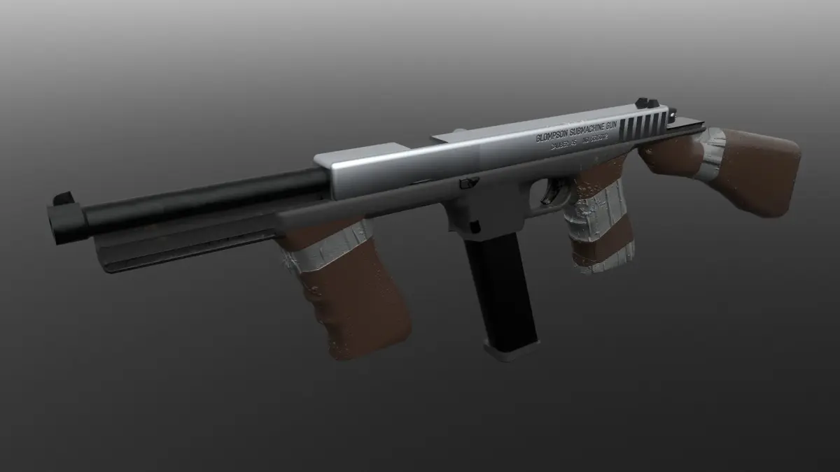 The Glompson Submachine Gun, an abomination made up of a moving slide and a Browning-type tilting barrel lock mated with the approximate frame and mannerisms of the ever-venerable Thompson Submachine Gun of American fame.This design came to light from a very silly photoshop now made virtual and available.