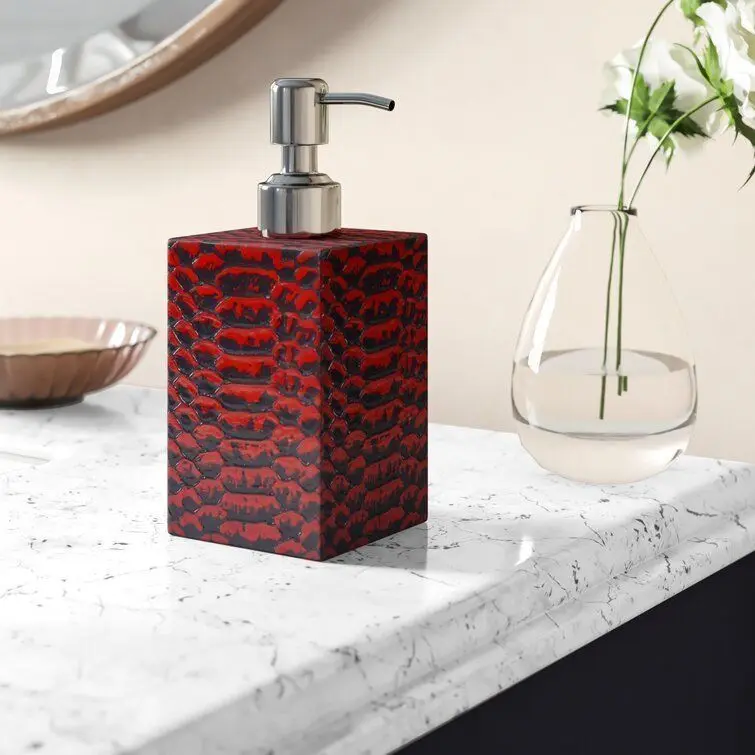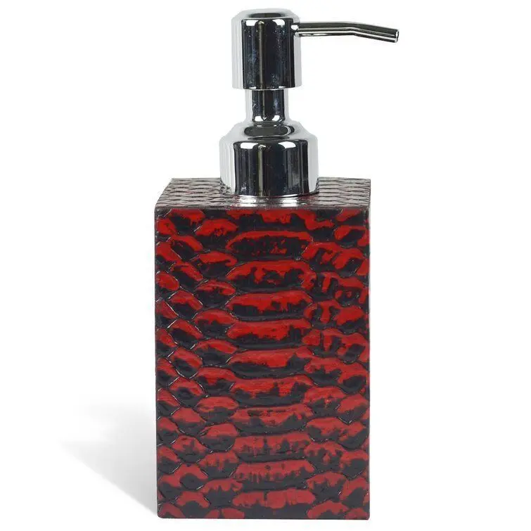 - With Lotion Dispenser, store your lotion or liquid soap dispenser that adds a nice accent to any room. Perfect for bathroom or kitchens in need of a punch of style. Made out of genuine leather. To clean use damp cloth.