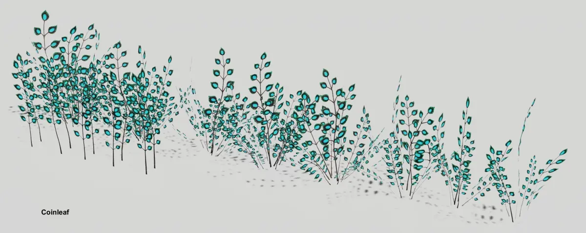 This set contains 7 species of small to middle-sized plants, which come as single-piece cards, three-dimensional planes (5 different shapes) and 8 small groups. The ‘greater fishtail’ item has minor 3D mesh parts, hence no card version is included for it. Height resolution of the plants varies between around 1000 to 2000 pixels. The material setup includes diffuse maps (with the surface texture and colouration being separate) roughness, normals and emission (for the bioluminescence), as well as a translucency effect. By having the colour and surface texture separate, it is reasonably easy to either edit the colouration of the plants with RGB curves or give the leaves a different colouration altogether. All plants also have glowing patterns, which can be edited in a similar way to the colours, or removed by setting the emission node to 0.