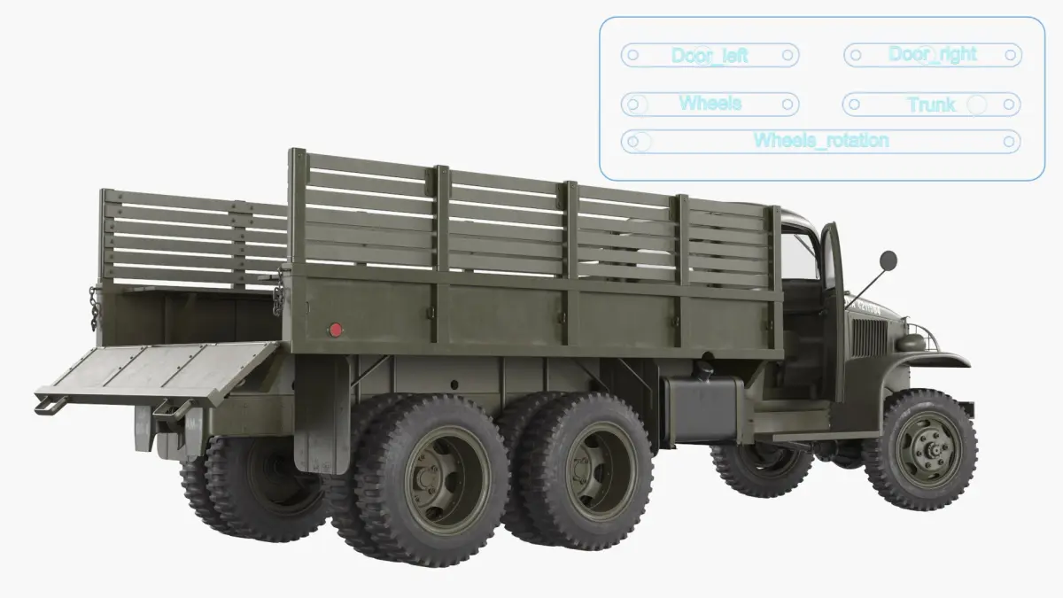 GMC CCKW-353 Military Truck with Open Cargo Bed Green Vintage Rigged is fully rigged and is ready to be animated. You can easily position it the way you need or animate it the way your project requires using helpers in 3D Studio Max. See the turntable to get an idea of how rigging works.