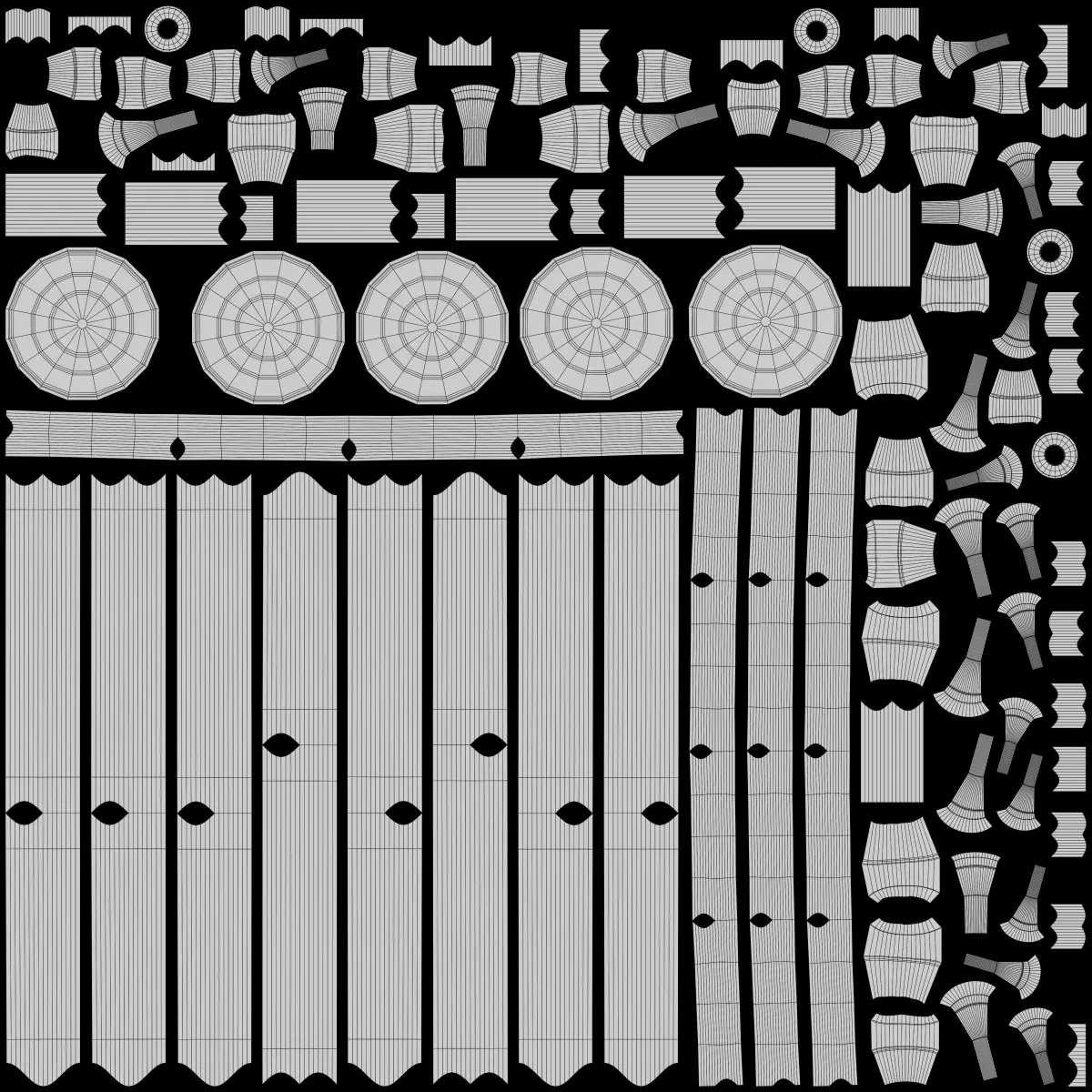 - Mixed UVs. Fountains - overlapped UVs for trim-textures. Pipes - non-overlapping UV's