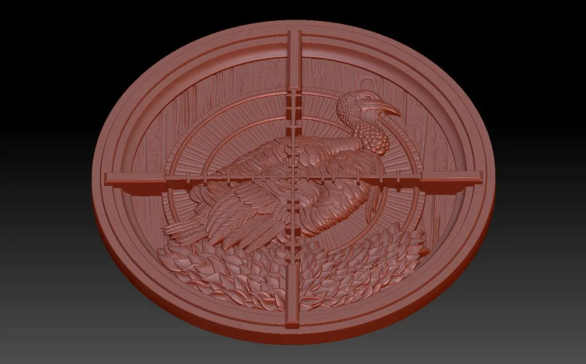 A 3D model of a bas-relief depicting a turkey. The bird is under the hunter's gun. The work is suitable for 3D printing and CNC machine tools.
