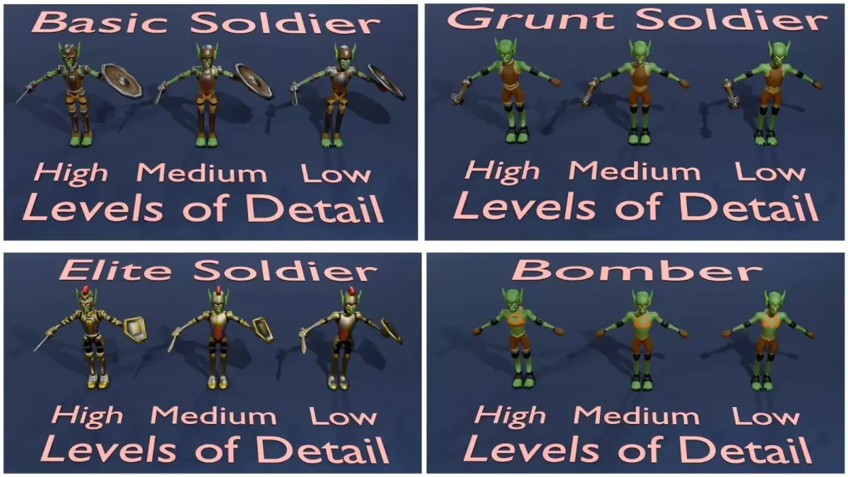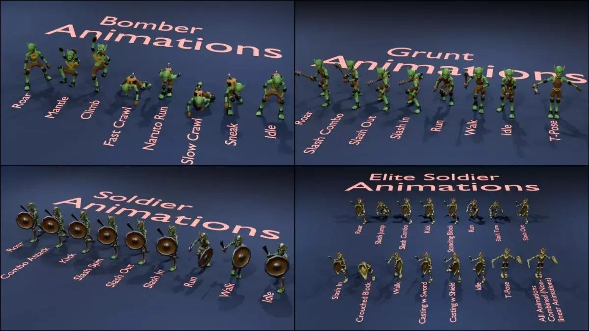 Contains 4 different army units, each with their own style of clothing, armor and weapons (Bomber, Grunt, Basic Soldier, Elite Soldier) each with 3 levels of detail for optimization. All the models are rigged and each have between 9 and 15 unit specific animations included. Also contains a fully rigged Goblin General, bringing the total to 13 rigged models (59 rigged models if you include all the skinned animations).