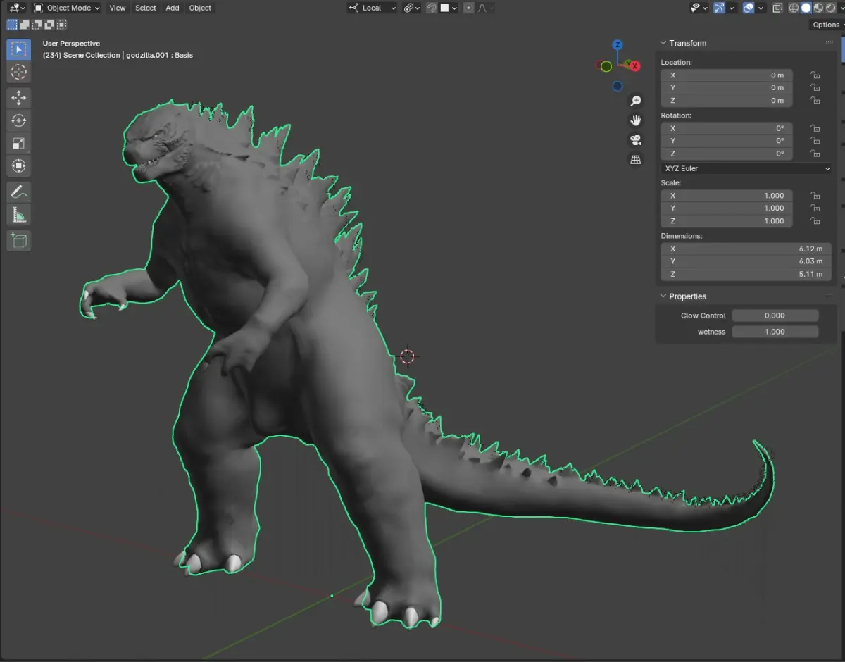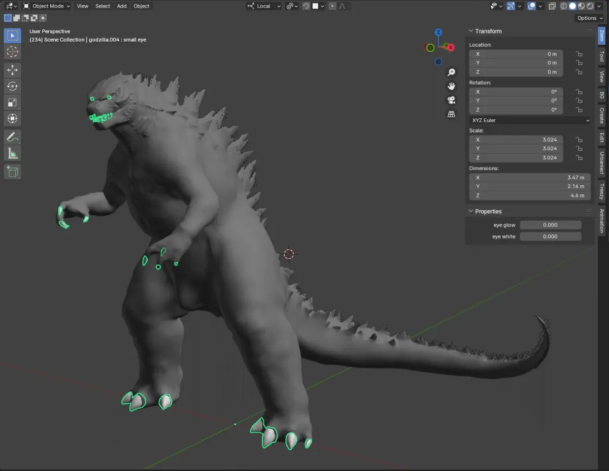 This model has taken me quite a while to complete. a lot of trial and error. But it is finally complete. Dare I say this is the best 3D Godzilla model out there? I have tried to perfectly recreate Godzilla 2014 as seen in the movie with all the exact same details. This model started originally off the Warzone model but has had upgraded textures, especially in the face and chest region, with a completely new paint for the dorsals. The model has a multiresolution modifier attached to it with up to 5 levels of subdivision. but I would not recommend going that high. I'd say the best place to render is the 2nd and 3rd levels if you're feeling crazy. I have attached 8K normals for both the unsubdivided body and the subdivided ones that account for 2 levels of subdivision. Those will be in a separate image folder. I have completely rigged the model in Rigify. and it also has parented lights within the mesh for the glow control. Unfortunately, the glow only really looks good in the Cycles render engine, but it also shows in EEVEE; it just has a lot of light bleed, but all of that is controlled with a slider that simulates the charge-up effect. Most of the textures are 8k and are pretty high quality. I'd say the basic image texture kind of brings down the quality of the whole model because the normals are quite impressive in detail, whereas the texture paint is a little grainy and hides some of the details that the model brings. but maybe I'll upgrade them later down the line. There is also an attached pose library that comes with a bunch of hand positions and other stuff... other than that, enjoy. Also, it would be nice if you tagged me in any post you make with the model; I'd love to see what you guys make with it. Have a blessed day. :))))