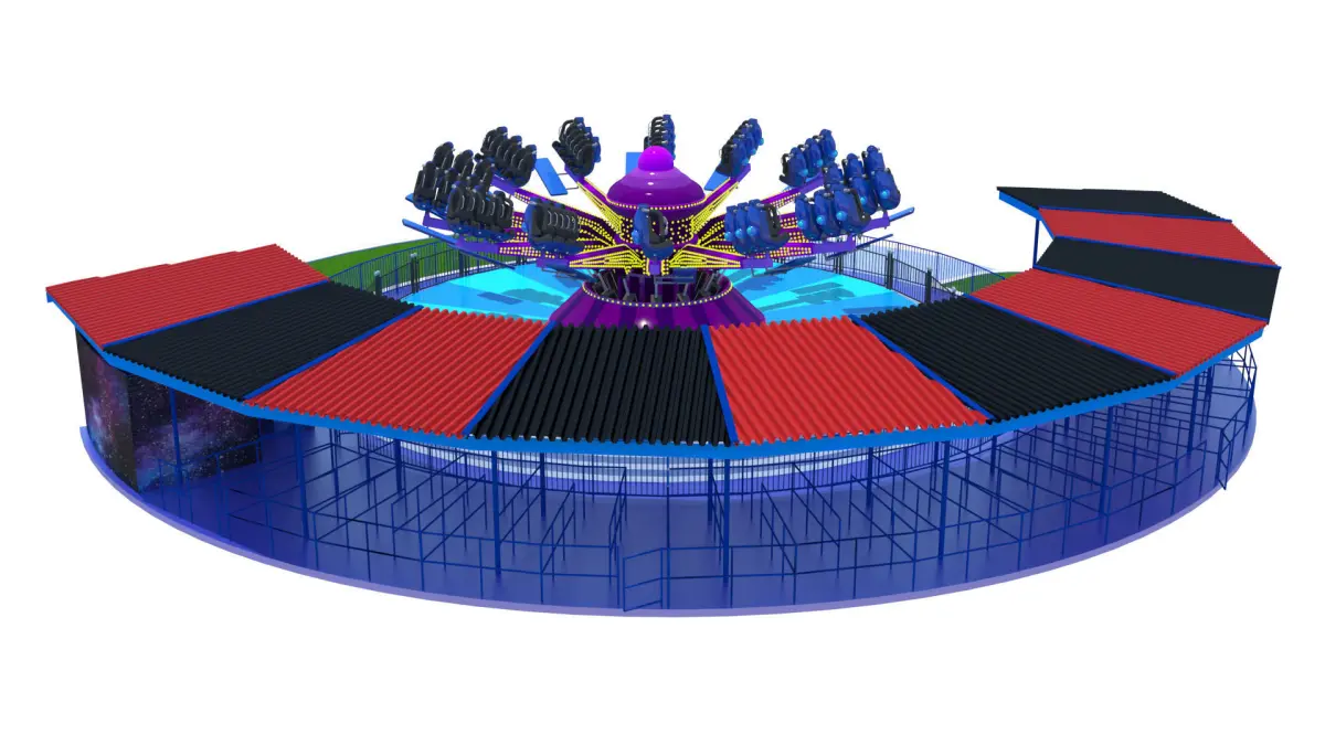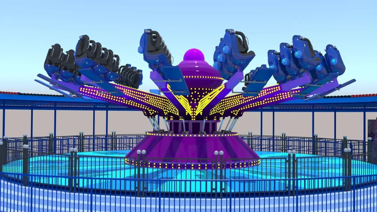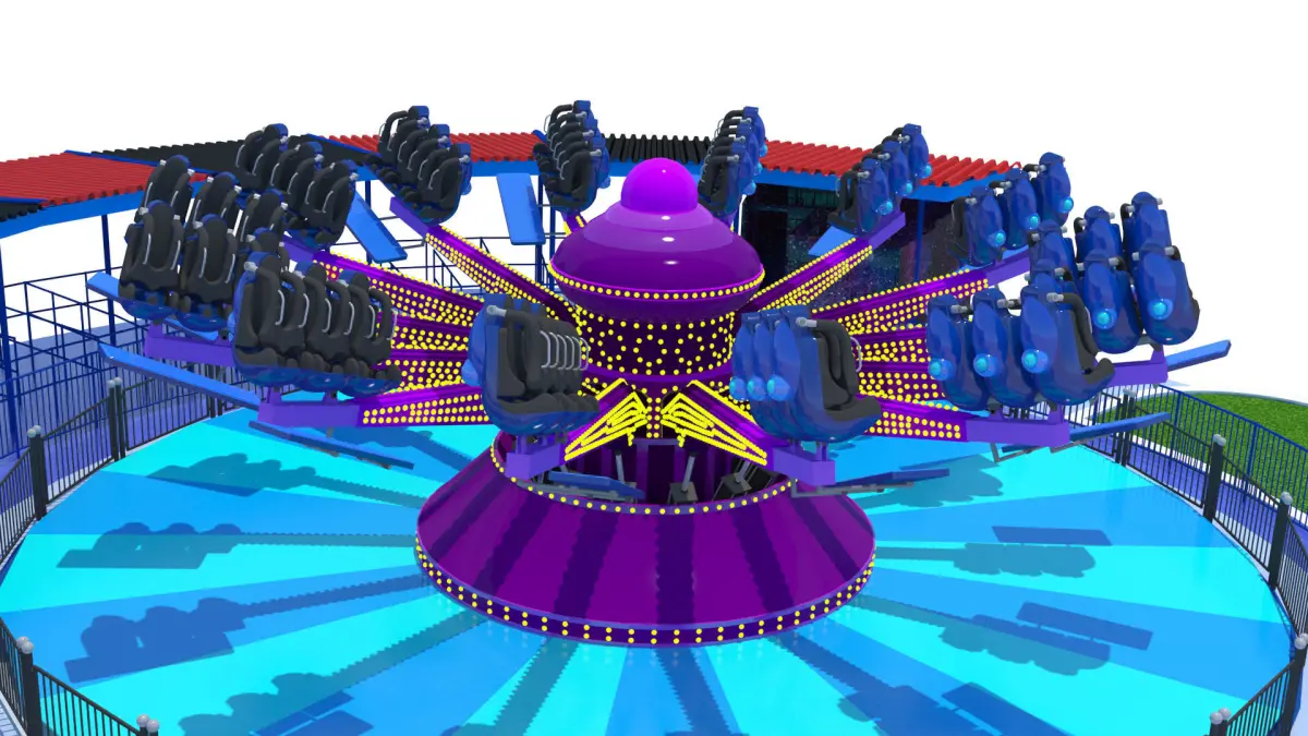 It’s a jet ride consisting of a decorative central base and 14 sharp-color gondolas which are supported by air compressors and arms. Riders cannot only enjoy its rotating but also the exciting bouncing up and down which can experience the sudden moment of weightless. Each gondola accommodates 3riders; each gondola is equipped with one shared safety lap bar that is combined with handrails. With the deluxe lightings, it must become a very attractive centerpiece in any park.