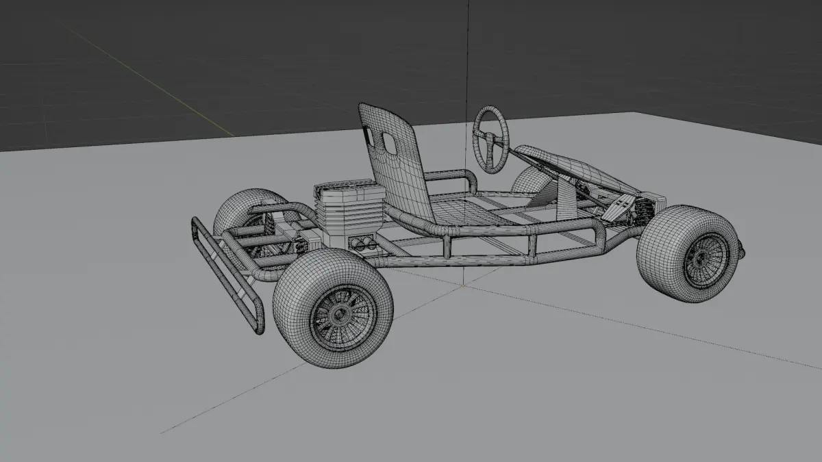 A detailed tube frame gokart with an engine, throttlebody, exhaust, steering wheel, tyres, wheels, plastic seat.