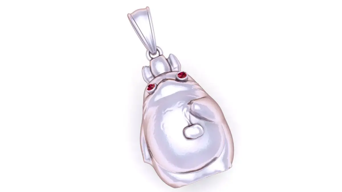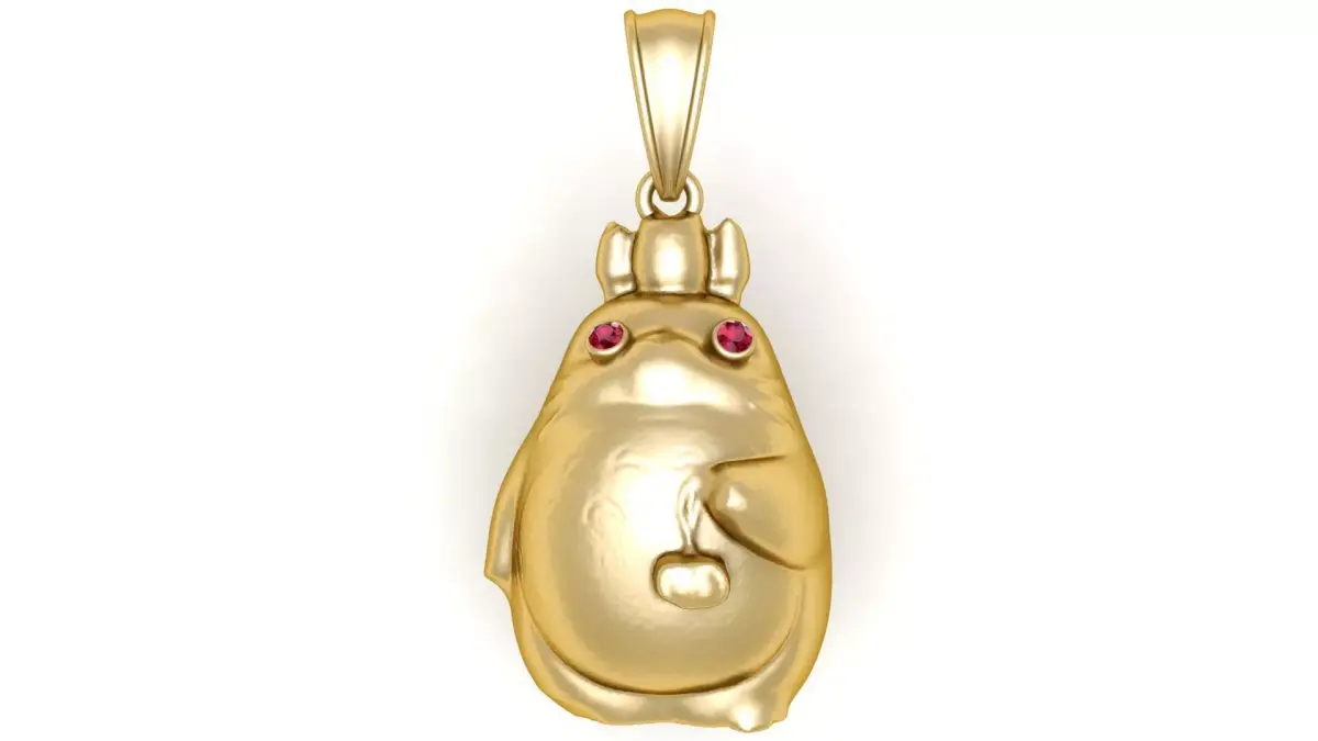 This charming gold pendant is designed in the shape of a cute, rounded animal figure with a whimsical touch. Featuring expressive ruby-red gemstone eyes and a smooth polished body, the piece exudes both playfulness and elegance. Its unique and creative form makes it a standout accessory, perfect for those who love character-inspired jewelry with a luxurious twist.
