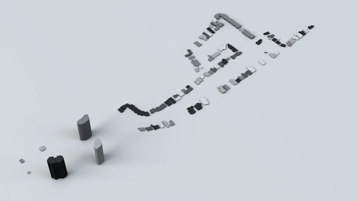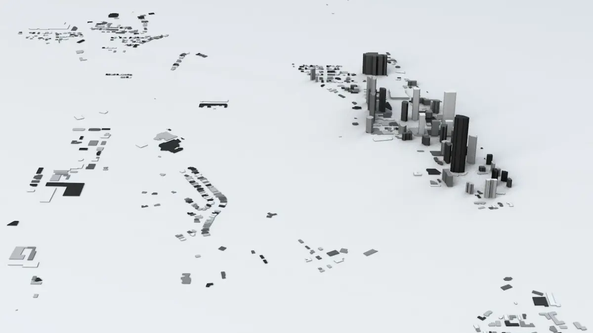 - the model is positioned on a flat surface (all buildings are on the “floor” - no elevation data included)