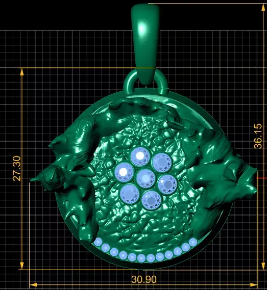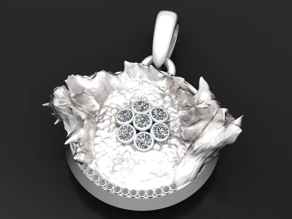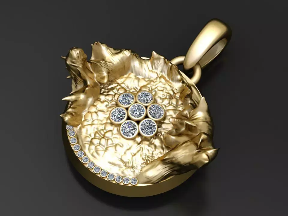 This gold pendant captures the essence of organic elegance, resembling a molten gold crater with intricate textures and gemstone accents. The central cluster of round-cut diamonds radiates brilliance, while a line of smaller diamonds along the edge adds extra sparkle. The sculpted, flame-like border creates a dramatic and luxurious frame, making it a statement piece for any jewelry collection.