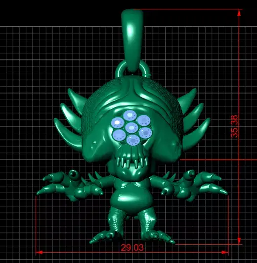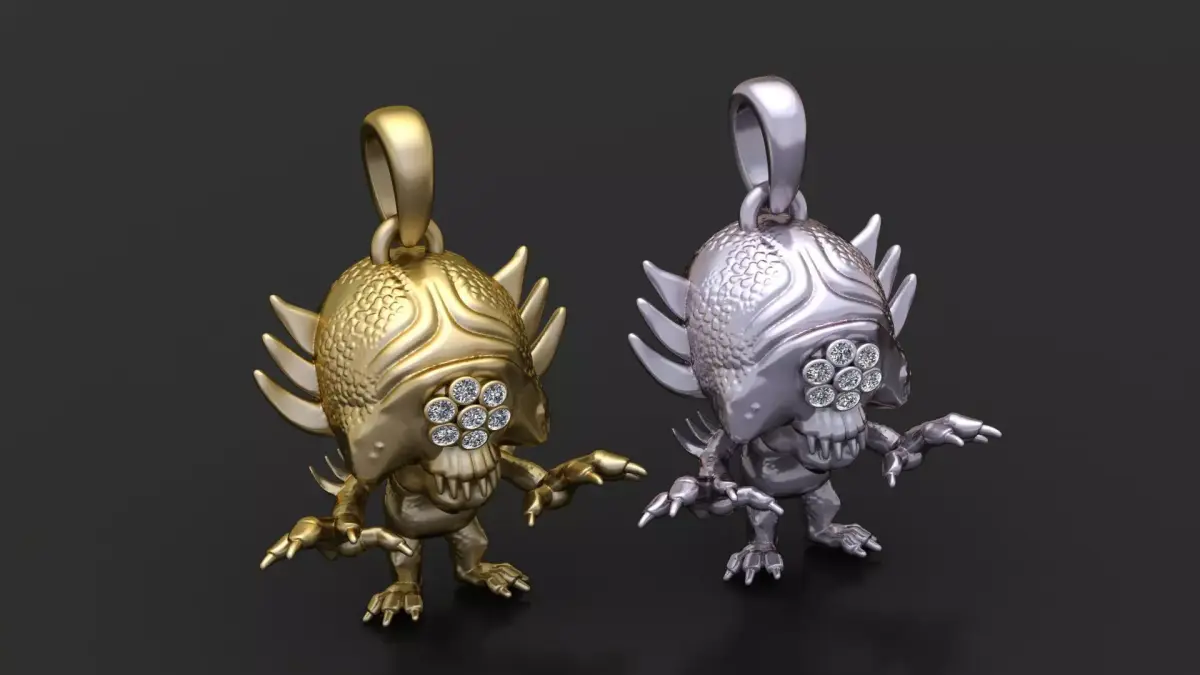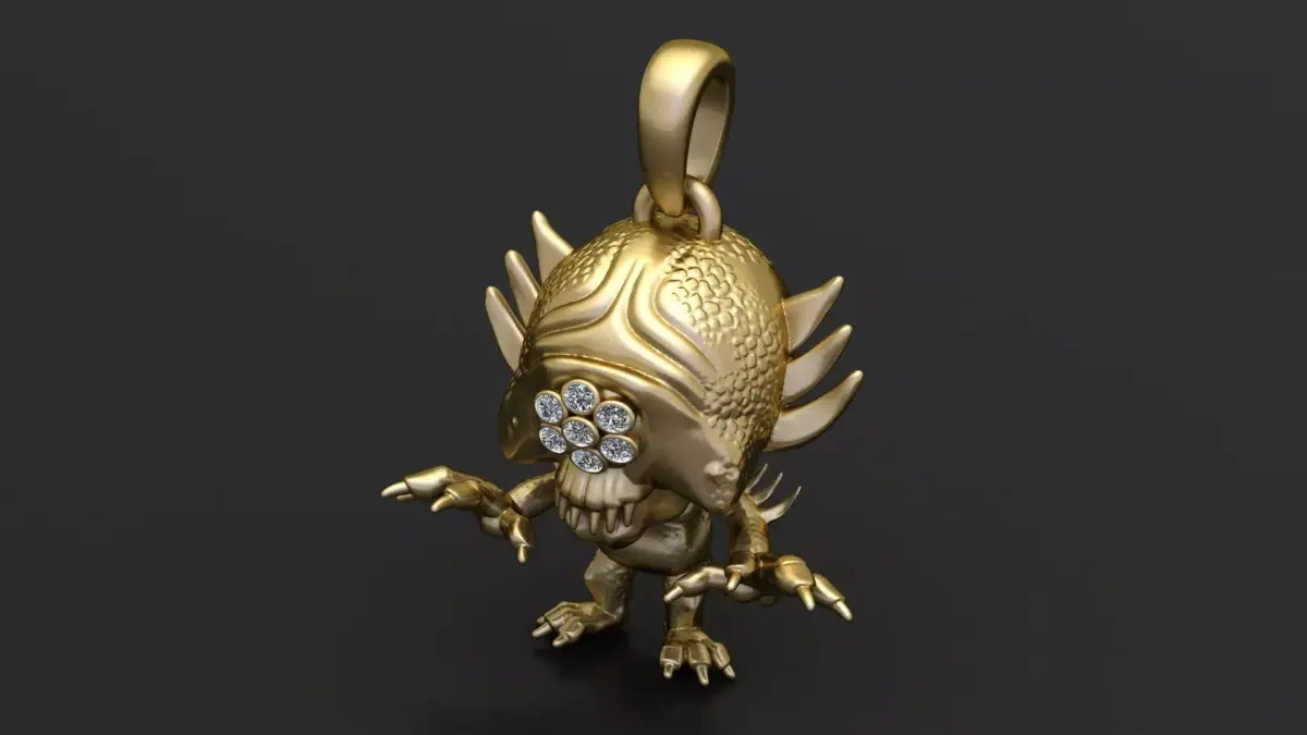 This striking 3D model features a gold pendant sculpted into a fantastical creature with intricate anatomical detailing. The design includes a textured, armored head with spine-like protrusions, clawed hands, and a fierce stance. The creature’s “eye” area is set with a cluster of seven brilliant-cut diamonds arranged in a circular pattern, giving the design a dramatic focal point. The combination of high-polish and textured gold surfaces adds depth, making this a standout piece for fantasy-inspired luxury jewelry.