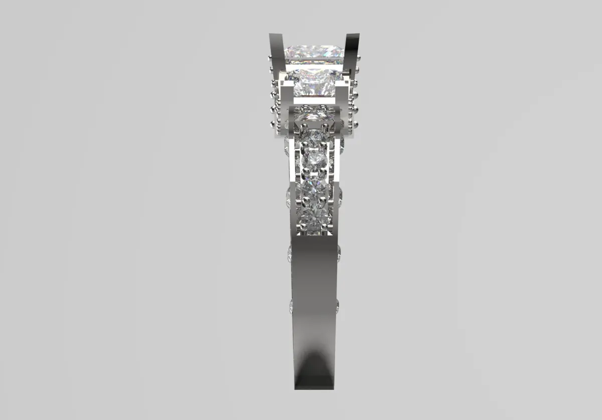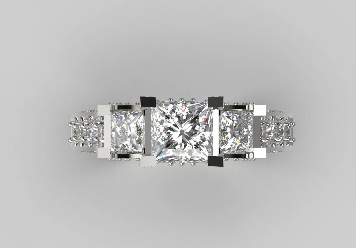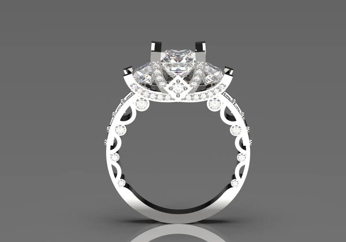 This ring has a beautiful and luxurious design with a large square-cut diamond in the center that reflects the light in a dazzling way. On each side of this main stone, there are two smaller diamonds that double its beauty and effect.